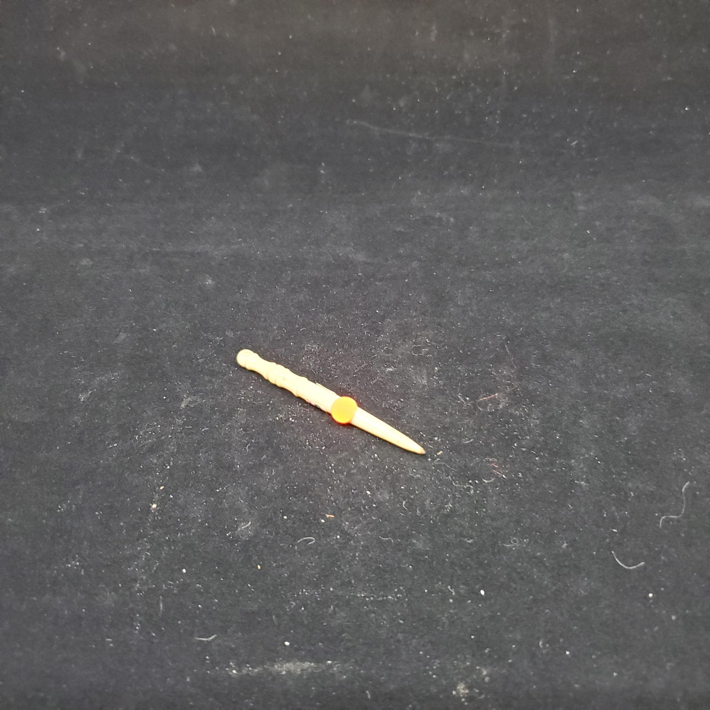 Bone punch, short, pointed but not sharp end. End tip is dark brown colour, remainder is light creamy colour. with light brown markings.Hole at top end for hanging. Horizontal line design and shaping on handle part..