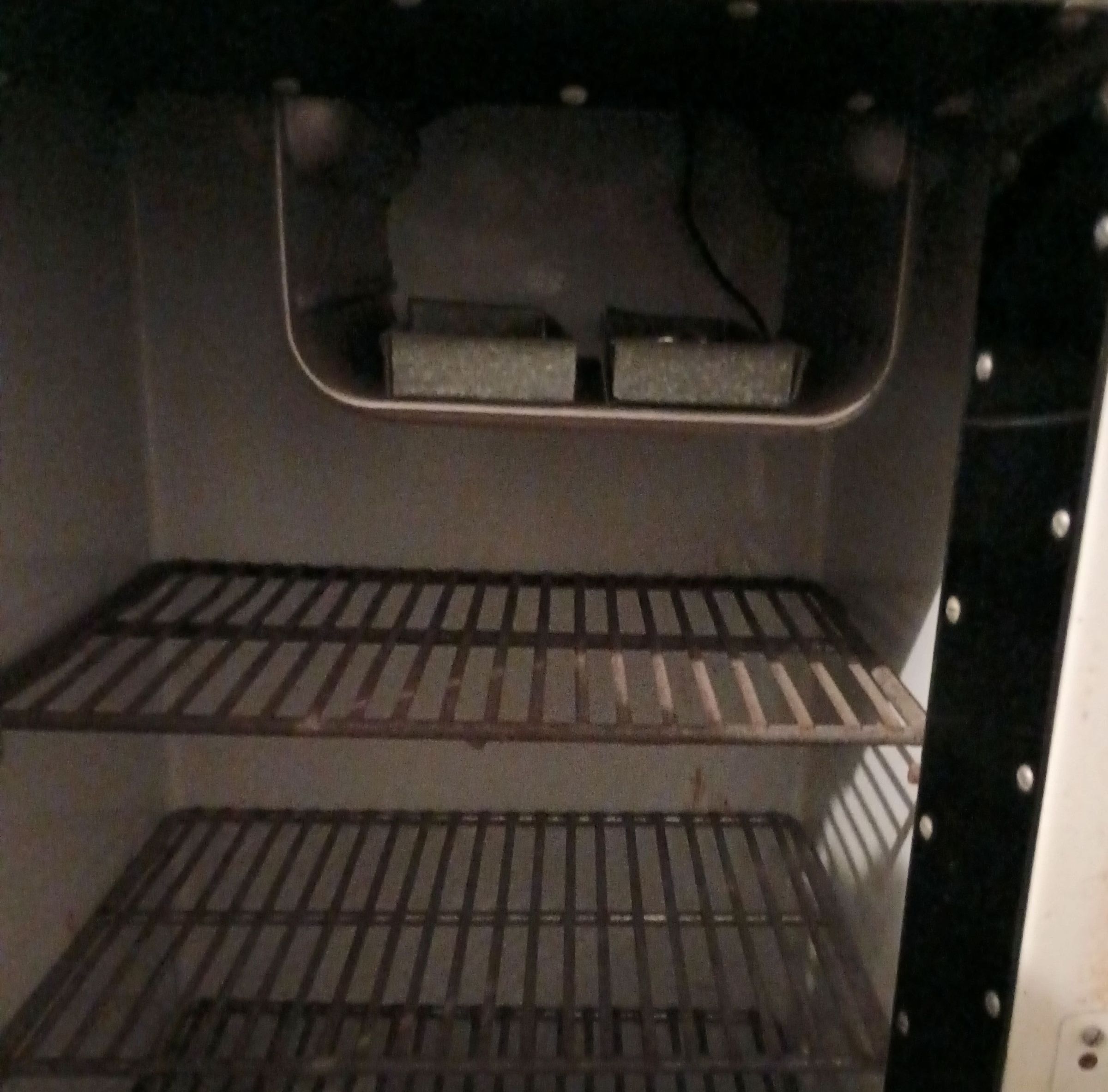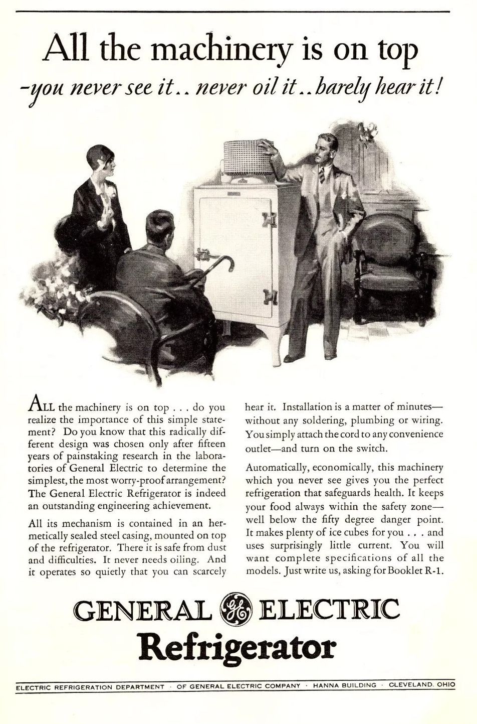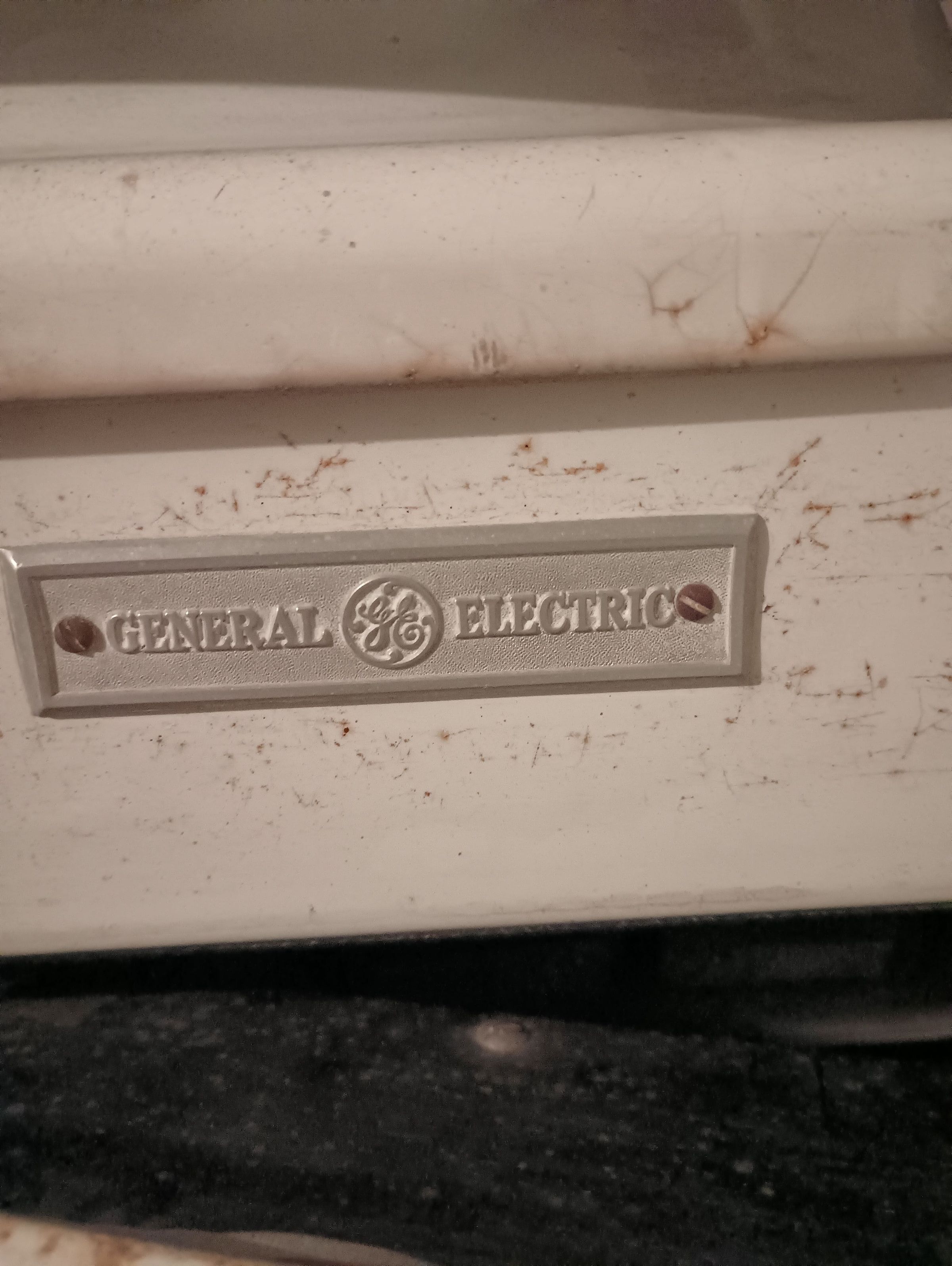 General Electric Monitor Top Refrigerator. White sheet metal. Defrost and temperature control. 3 shelves, 4 door racks. Small freezing compartment. Nickel plated handle catch. Motor is harmonic unit CA1B16 type. Circa 1930