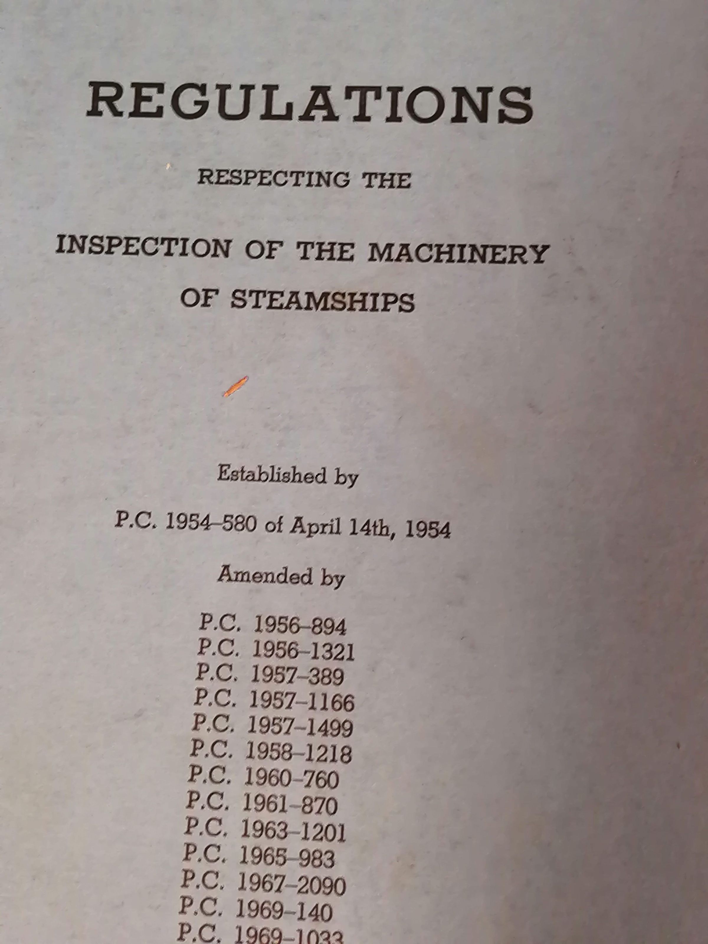 Regulations respecting the inspection of the machinery of steamships. Established by P.C. 1954-580 of April 14th, 1954
