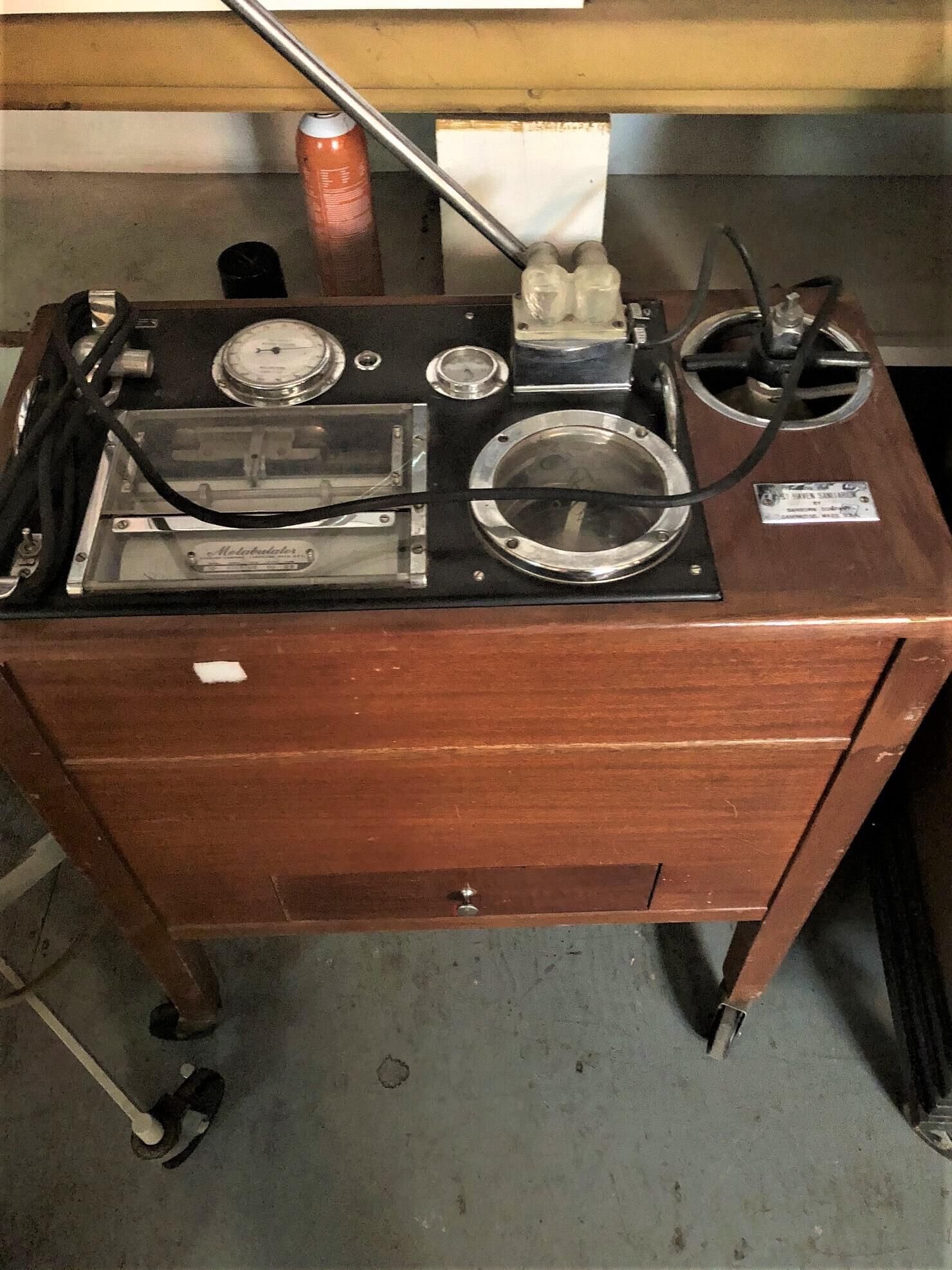 A Metabulator is a medical apparatus used to measure a patient’s metabolic rate by measuring the consumption of a fixed amount of oxygen, Carbon dioxide is absorbed in an absorption chamber containing chemicals. There is an inbuilt recording compartment with paper roll.
