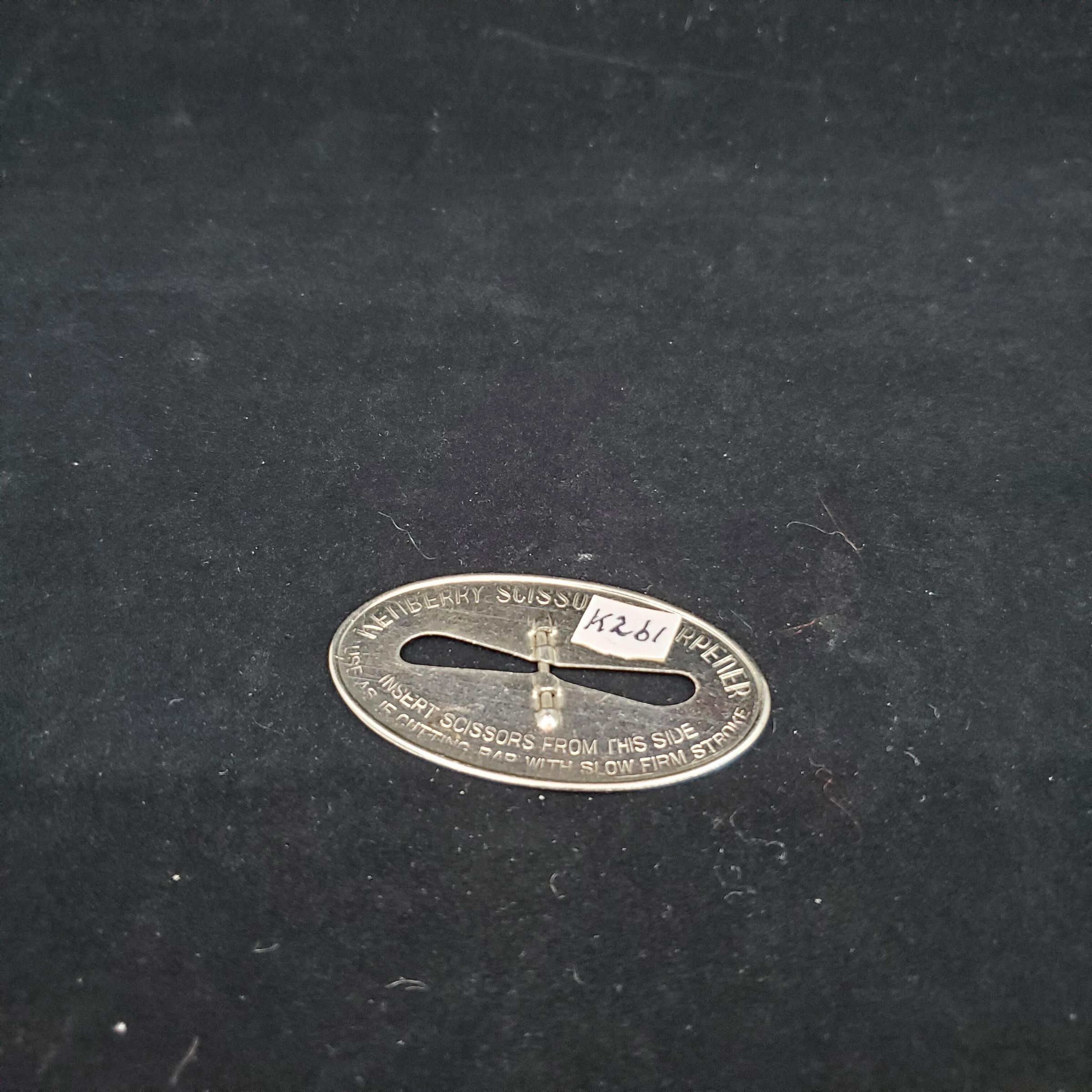 Metal scissor blade sharpener. Oval shaped silver coloured metal.Bow shaped cutout area with rod of metal across center part. Stamped ÒKenberry Scissor Sharpener Ò and also instructions for using.