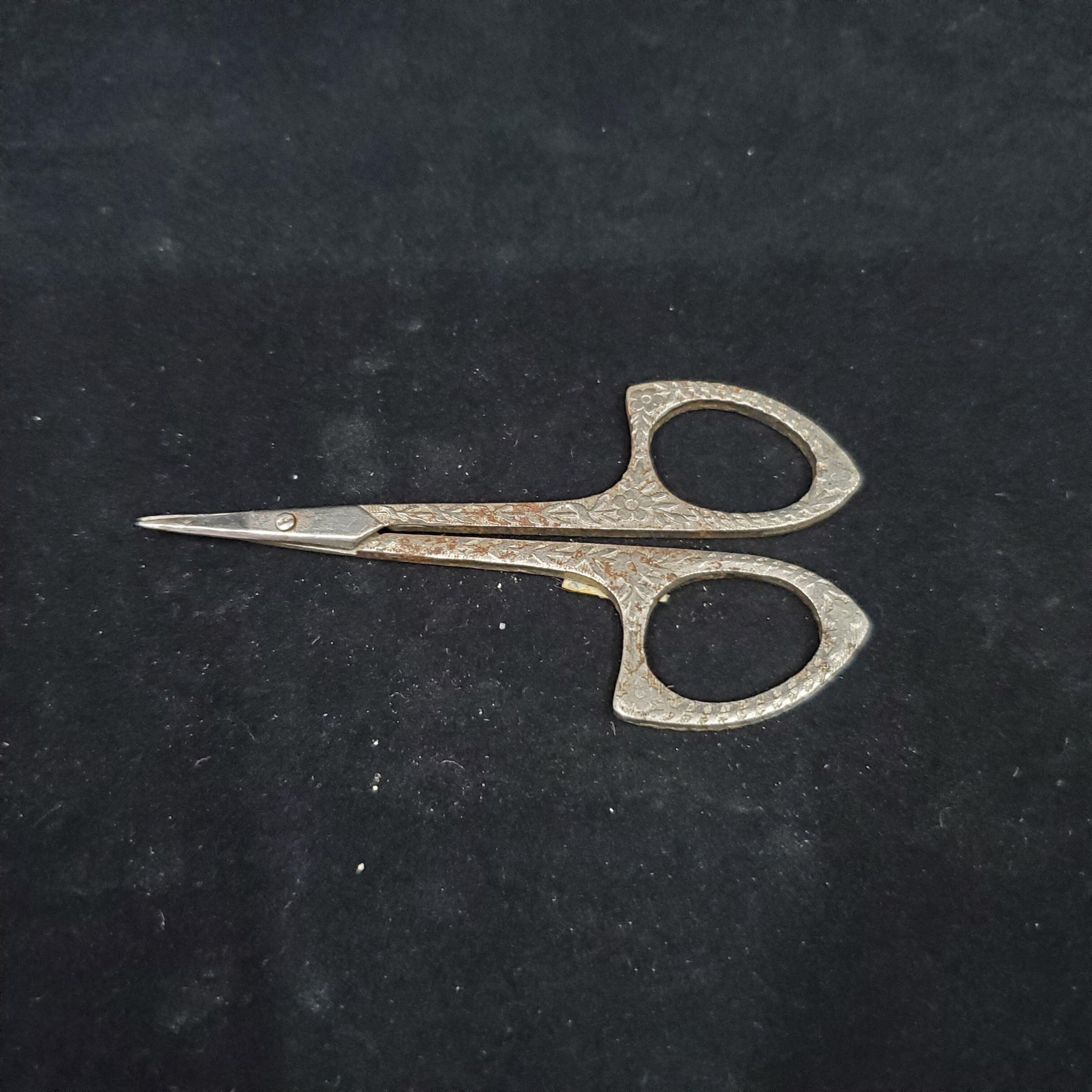 Steel embroidery scissors with all over pattern of flowers and leaves on handles and shanks. Worn and some rust showing. No Marks.
