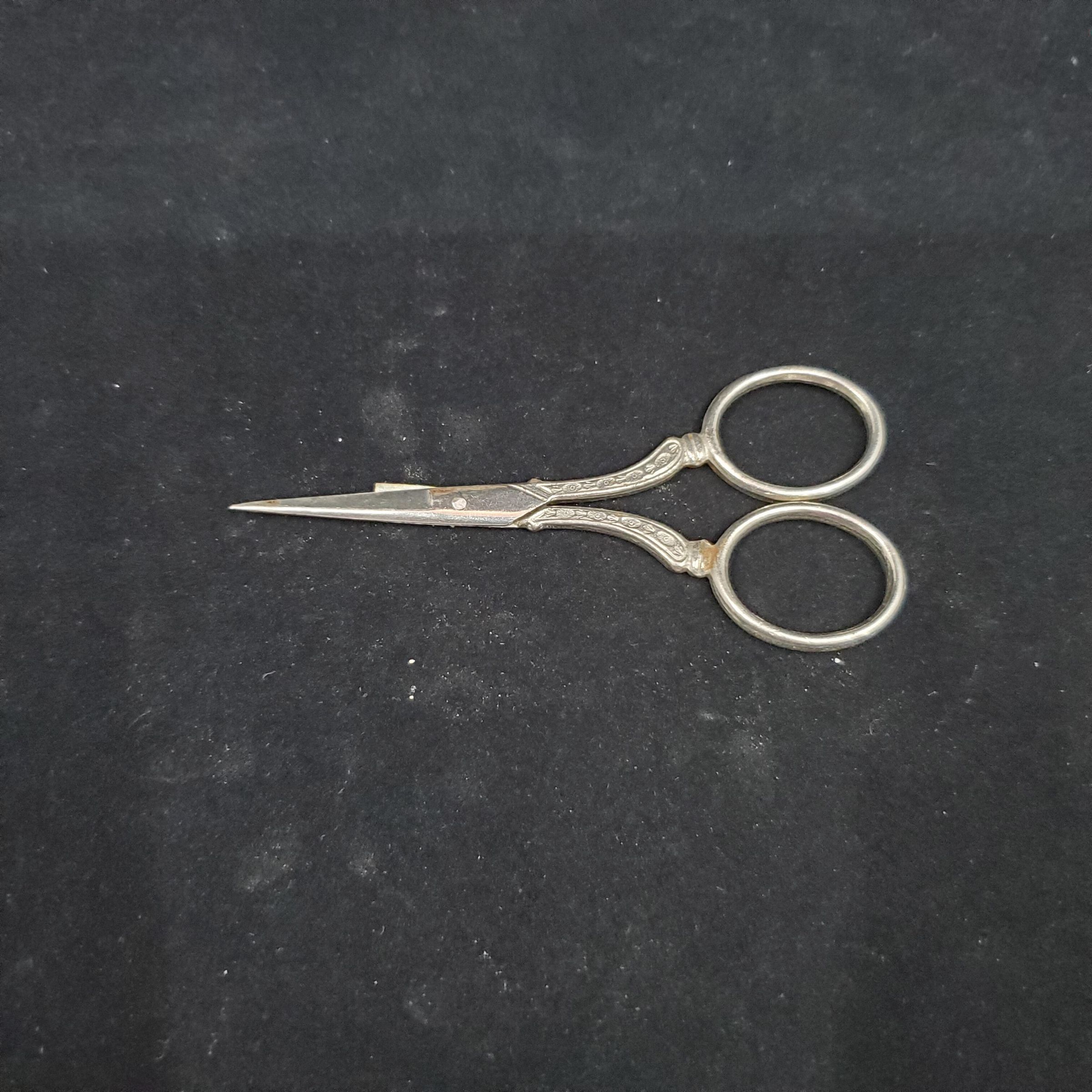 Embroidery scissors, steel, Curved shanks with flower and leaf design - Art Deco? Stamped ÒForeignÓ.