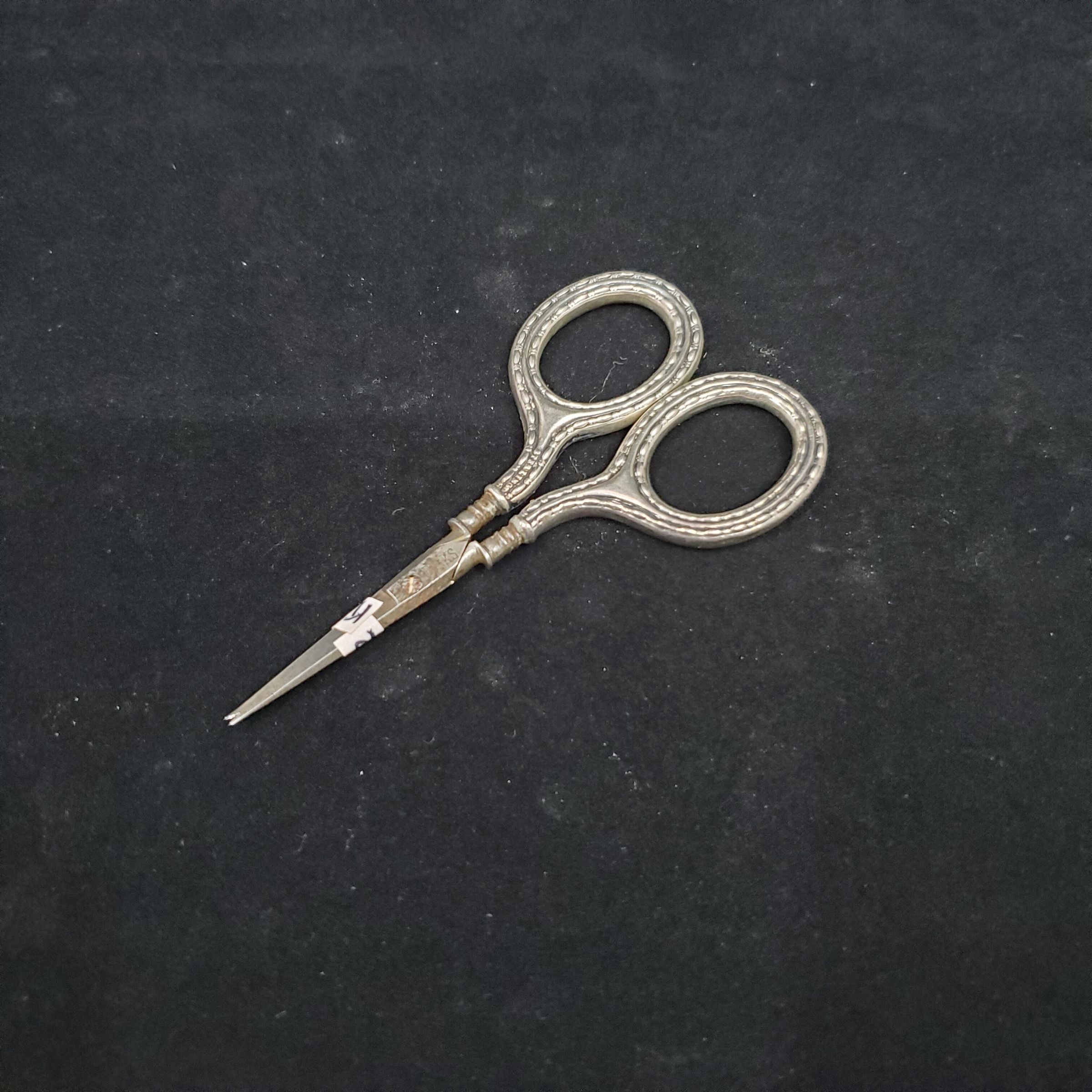 Embroidery scissors with sterling silver handles and shanks. Pattern around long horizontal ovals with 2 short vertical ovals betwen - double row around handles and shanks. Handles stamped Sterling, blades stamped Birks.
