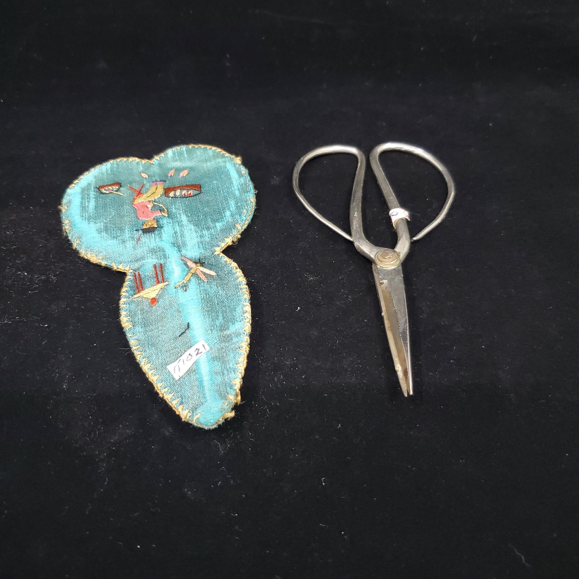 Embroidered silk scissor case with Oriental type scissors. Case -blue green background,outlined in yellow embroidery with oriental figures ,trees, flowers, boat ,butterflies. Scenes different back and front. Case lined in lighter green. Steel scissors - large.