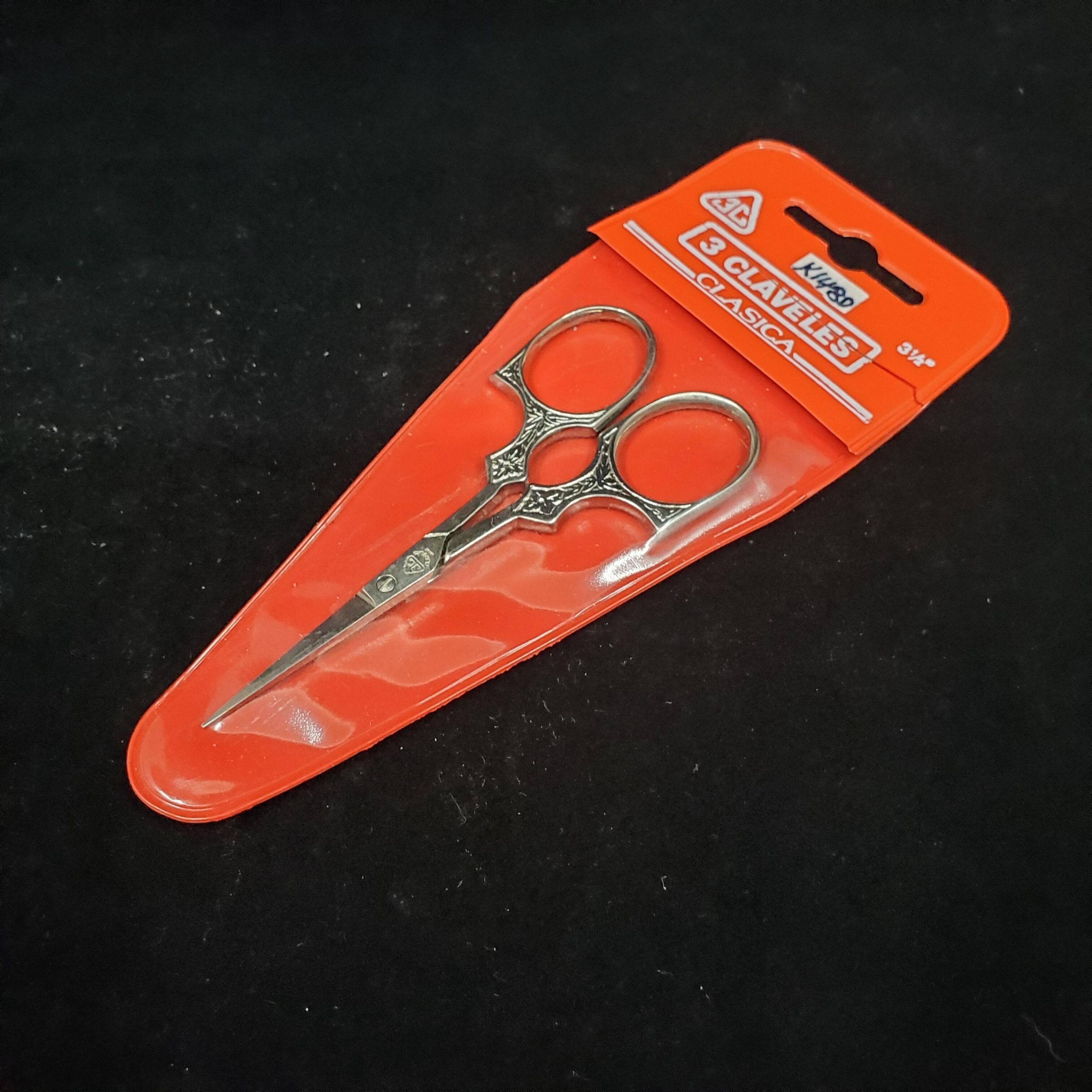 Embroidery scissors in case. Red plastic case one side, clear plastic other side. Advertising area at top of case reads Ò 3C 3Claveles 3 1/2Ó ClasicaÓ Ornamental shafts on scissors with flower and leaf pattern. Shafts also shaped. Blades have Ò3C logo Claveles SpainÓ.