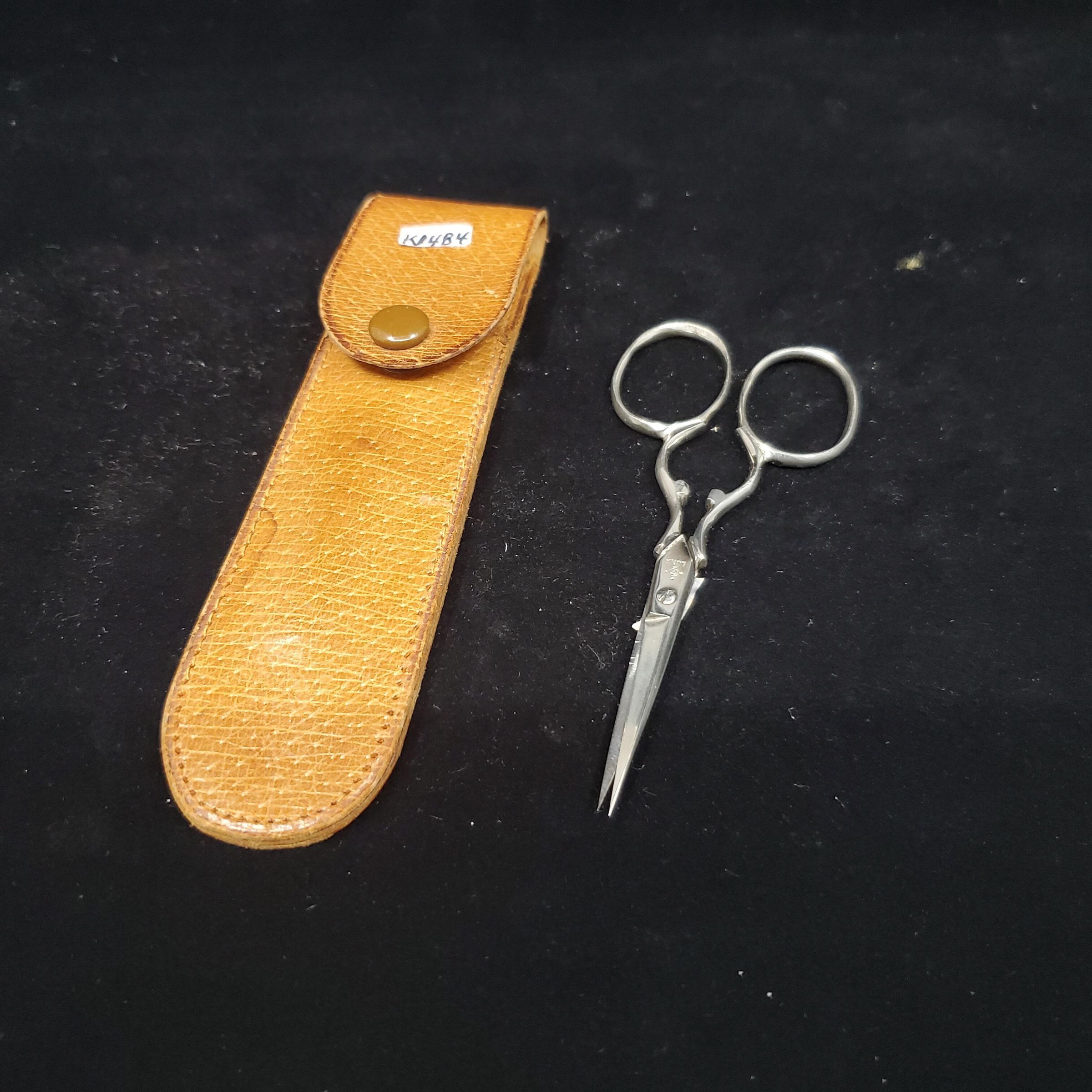 Embroidery scissors in leather case. Steel scissors with curved shanks. Blade stamped witrh a logo and ÒLUNAÓ Case in mid brown leather with dome closure. Slots for 2 pairs scissors.