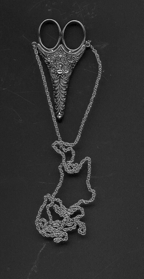 Embroidery scissors in sheath on chain. Silver coloured metal - probably pewter . V shaped sheath with embossed pattern of flowers and leaves on front, plain back. Small plain scissors. stamped Italy. Long metal chain from both sides of sheath.