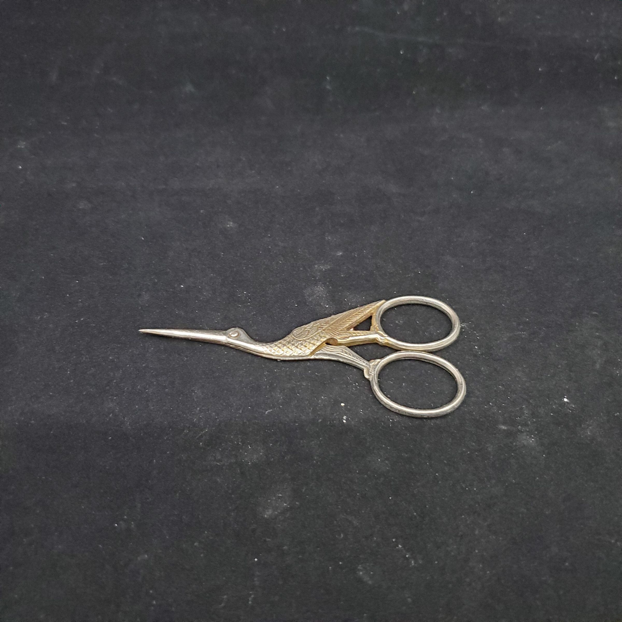 Steel stork embroidery scissors. Small. Originally gold plated and still shows signs. No marks.