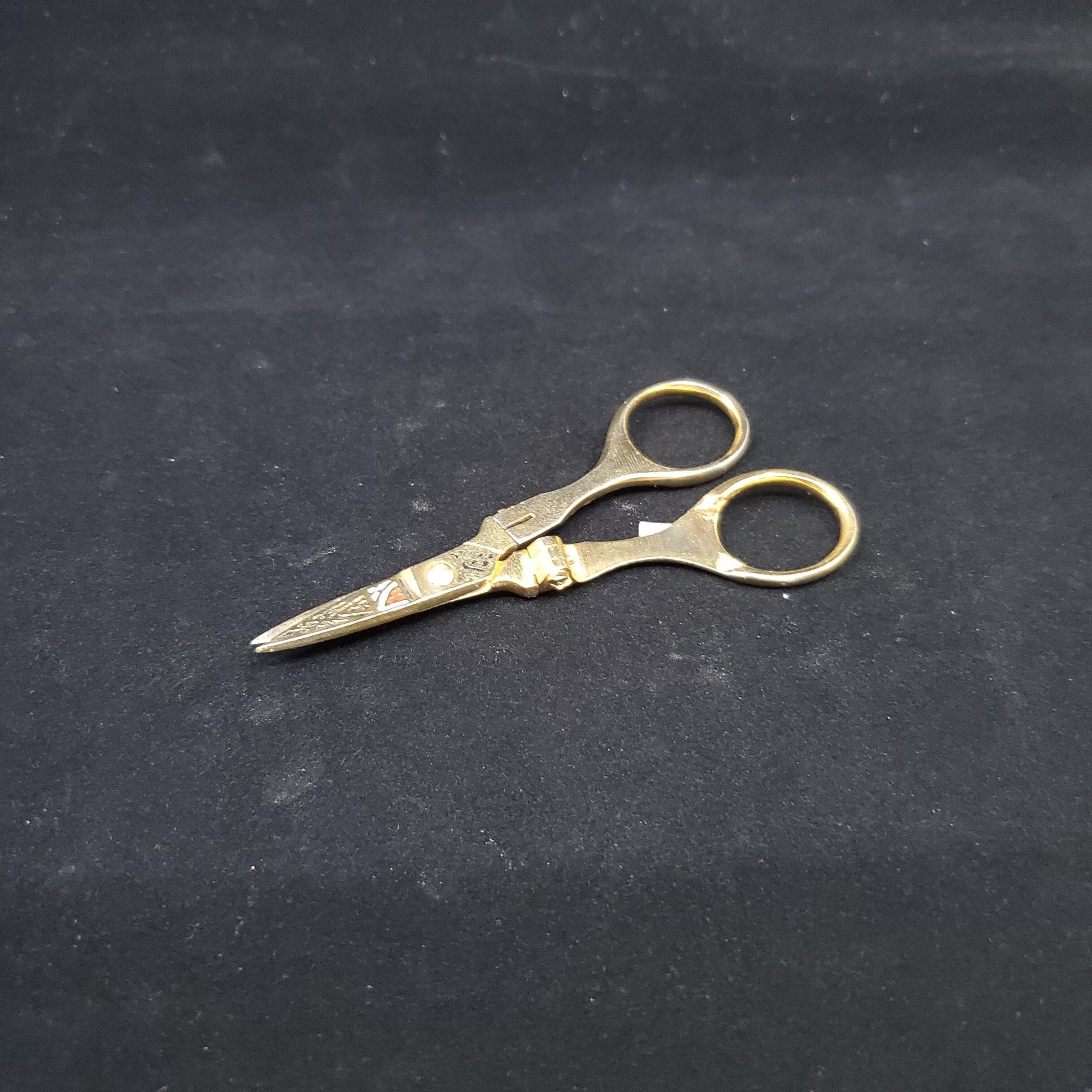 Folding scissors, steel with shiny gold finish. Souvenir. One blade has ÒToledo Ò and design in black on it. Other blade has design in black, red,blue and white.