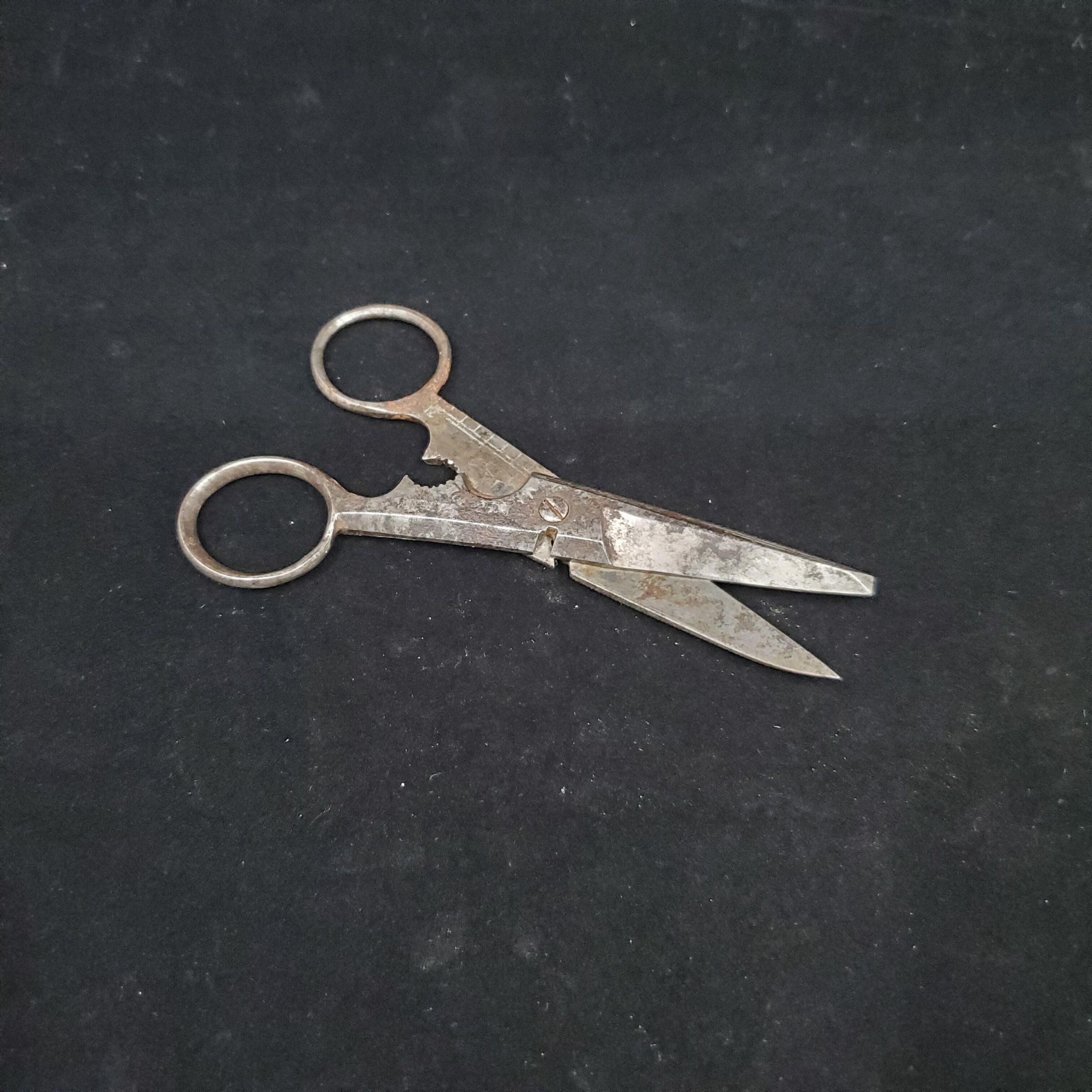 Many-purpose steel scissors. Blunt end for screw driver. One blade marked in inches. Nicks to use as wire cutters. Circular and notched curves for removing bolts and one edge is a file. Stamped J & Co. Sheffield.