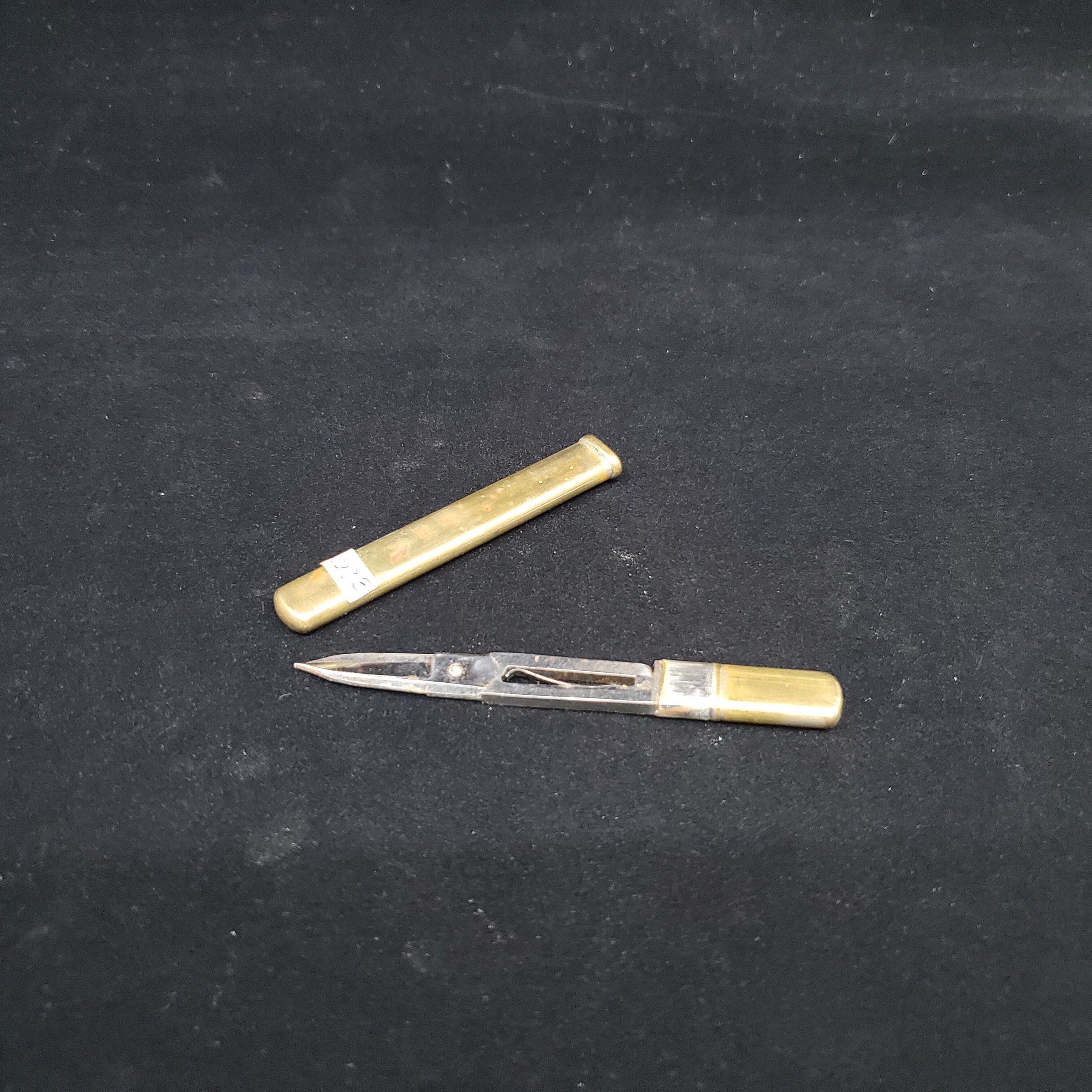 Narrow brass case with scissors forming end of the top of the case. Steel scissors. No marks.