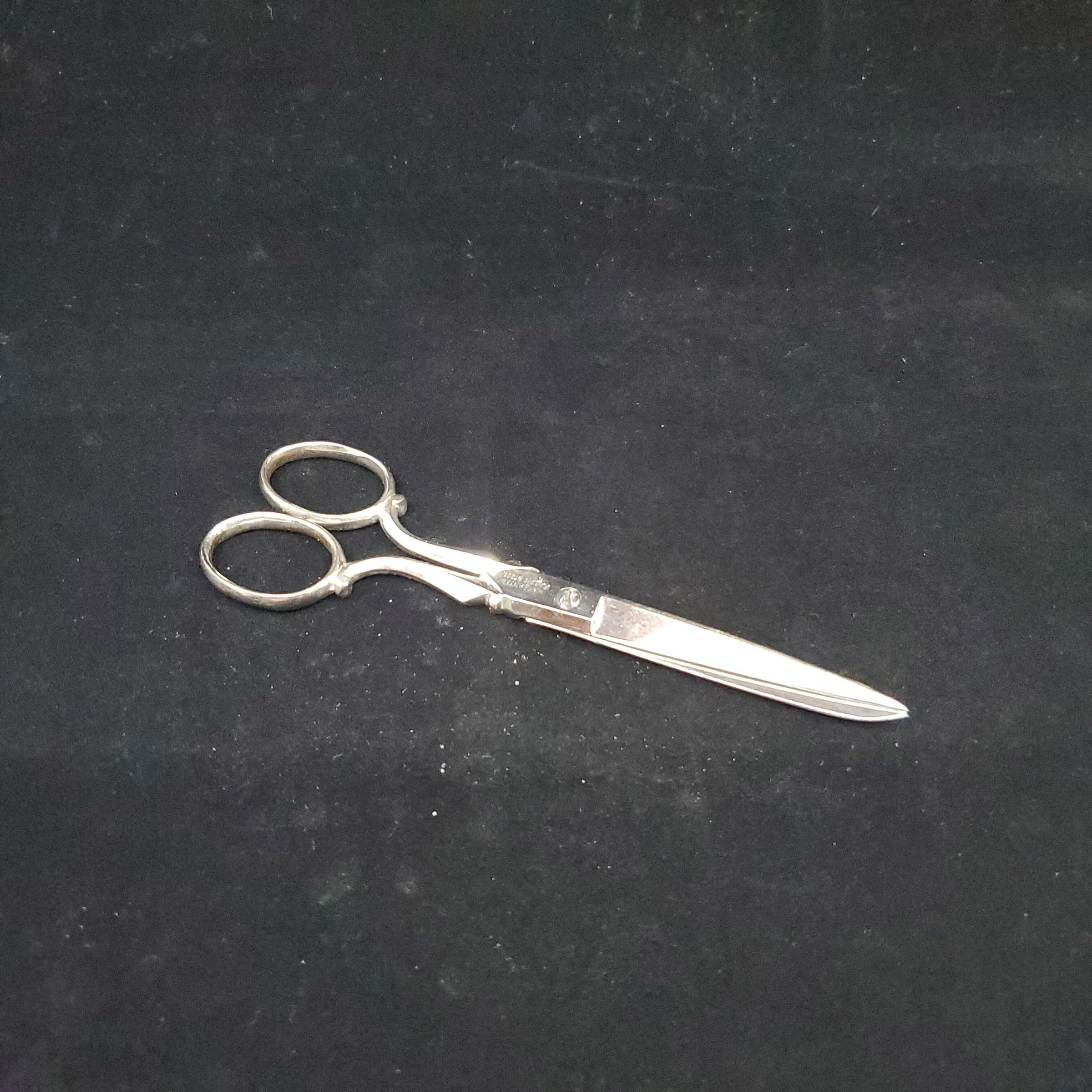 Steel scissors. Curved shanks with notched design at blade end. Stamoed ÒWarranted Forged SteelÓ