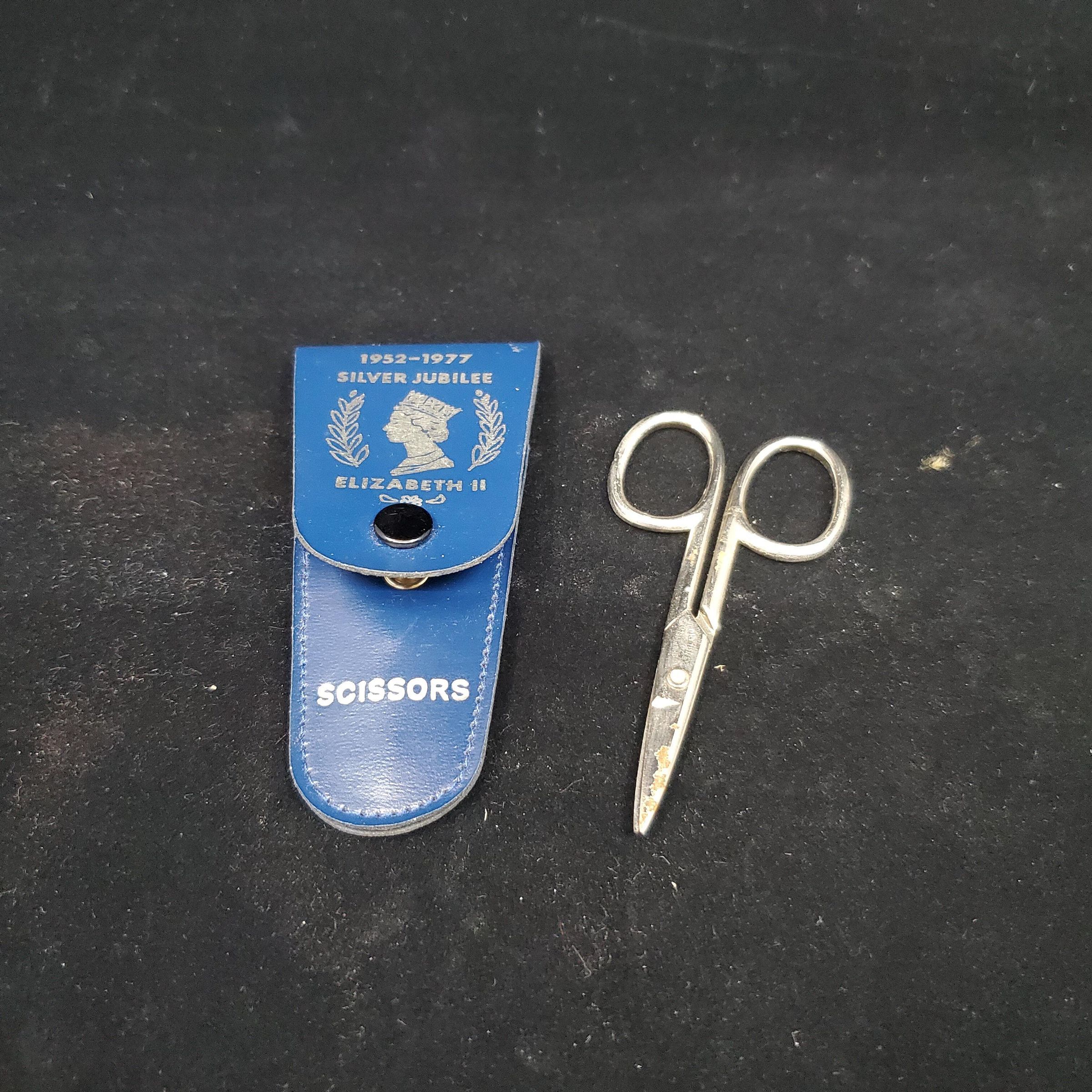 . Steel scissors in leather type ? case. Case blue with Ò1952 - 1977 Silver Jubilee Elizabeth 11 ScissorsÓ in silver colour on outside. with picture of Queen in crown and laurel leaves around. Scissors inside case stamped Sheffield England. Steel dome closure,