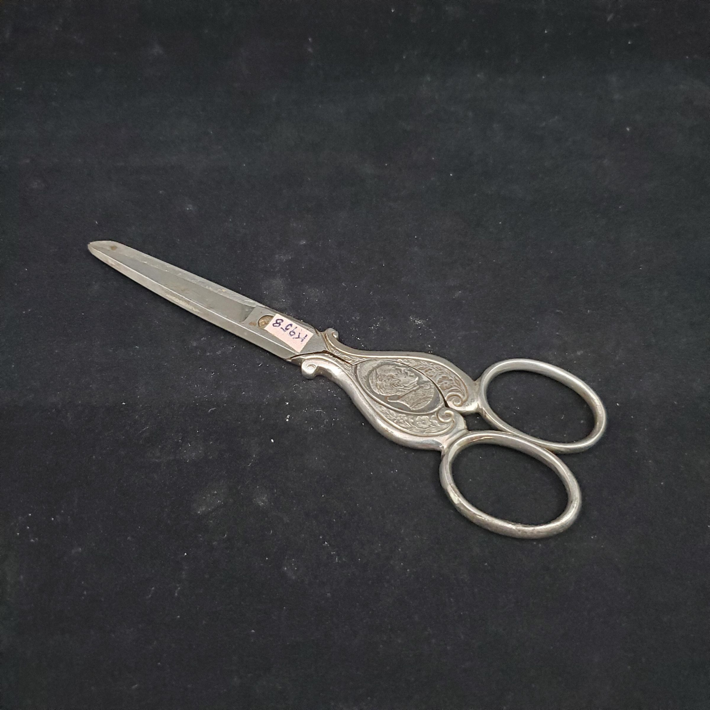 Steel scissors with decorated shanks. One side has oval disc with head of a veiled woman Other side has male head with a high collar . Floral decoration surrunds the ovals.