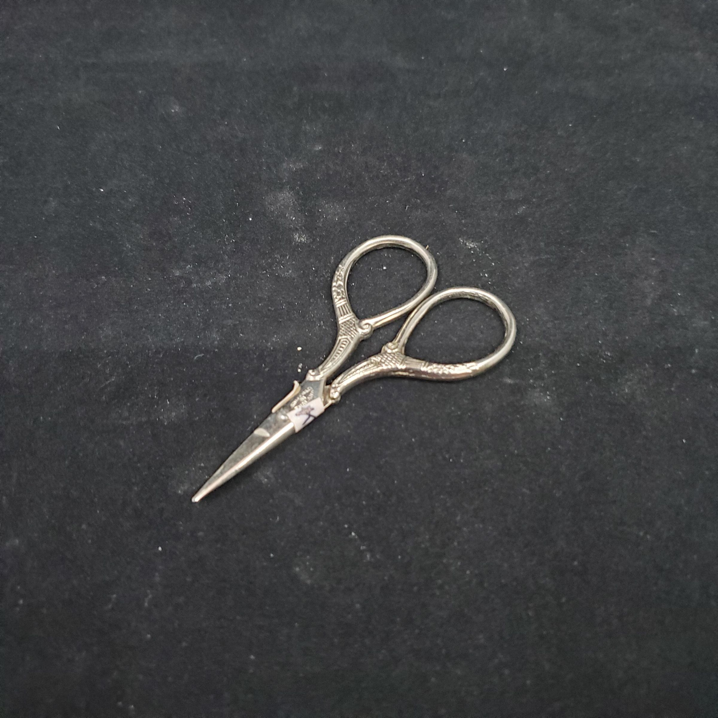 Miniature scissors, steel. Parrern on shanks and pasrt way up handles. Stamped on blades ÒSheffield 81 EnglandÓ
