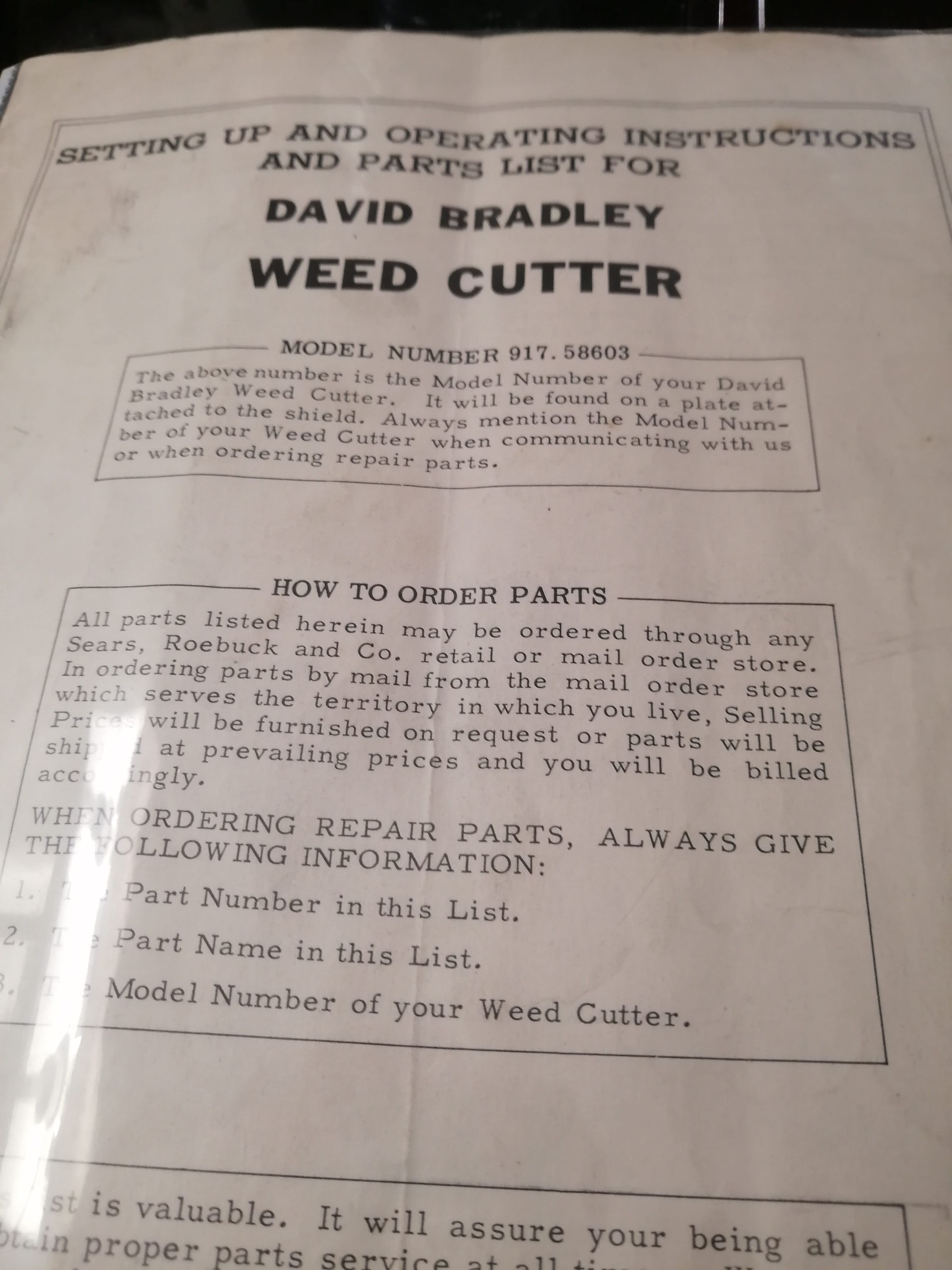 Setting up and operating instructions and parts list for David Bradley weed cutter