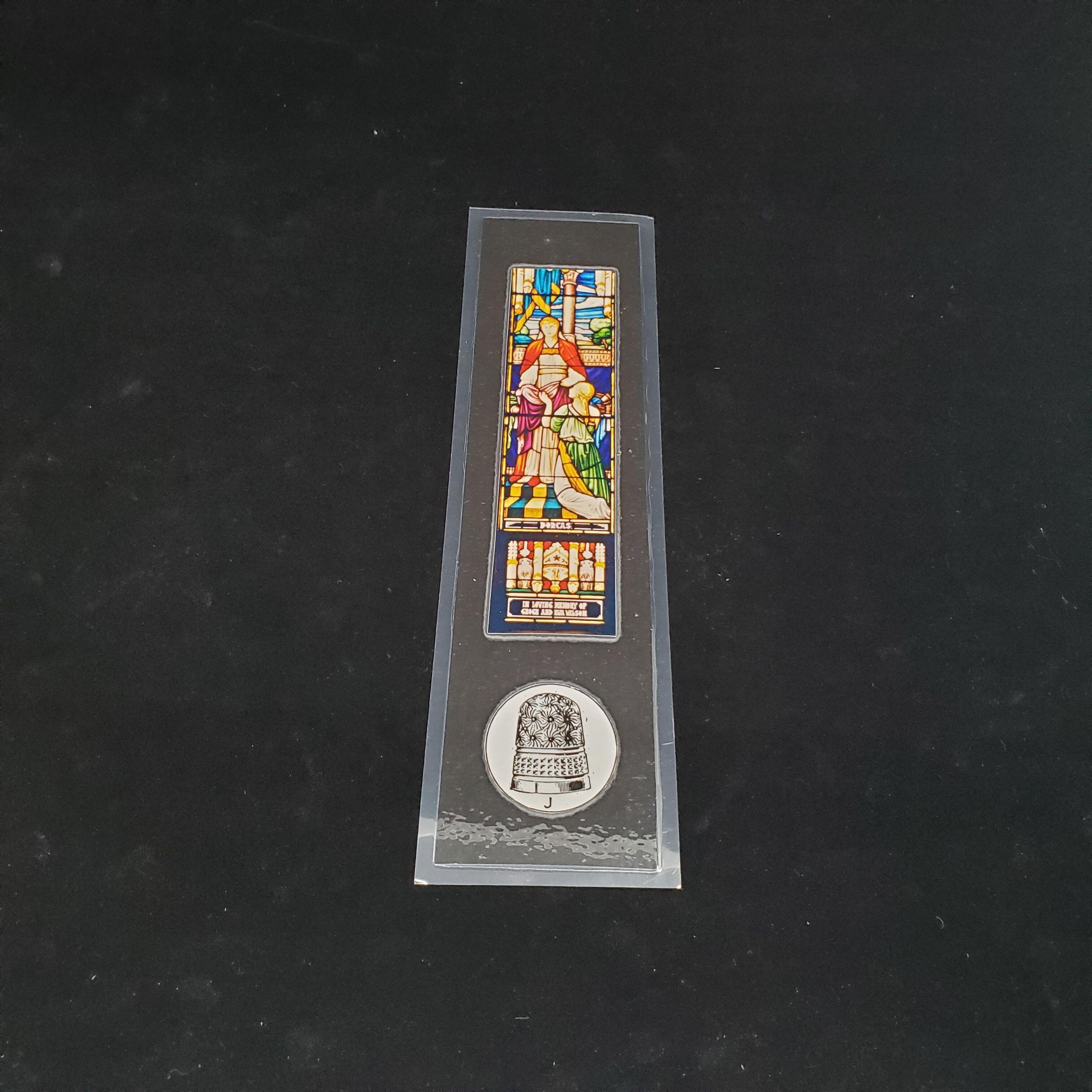 Plastic bookmark with stained glass window from St.AndrewÕs Presbyterian Church, Newcastle, N.S.W.Australia, showing life of Dorcas. A Dorcas thimble shown below. Story of window on back of bookmark.