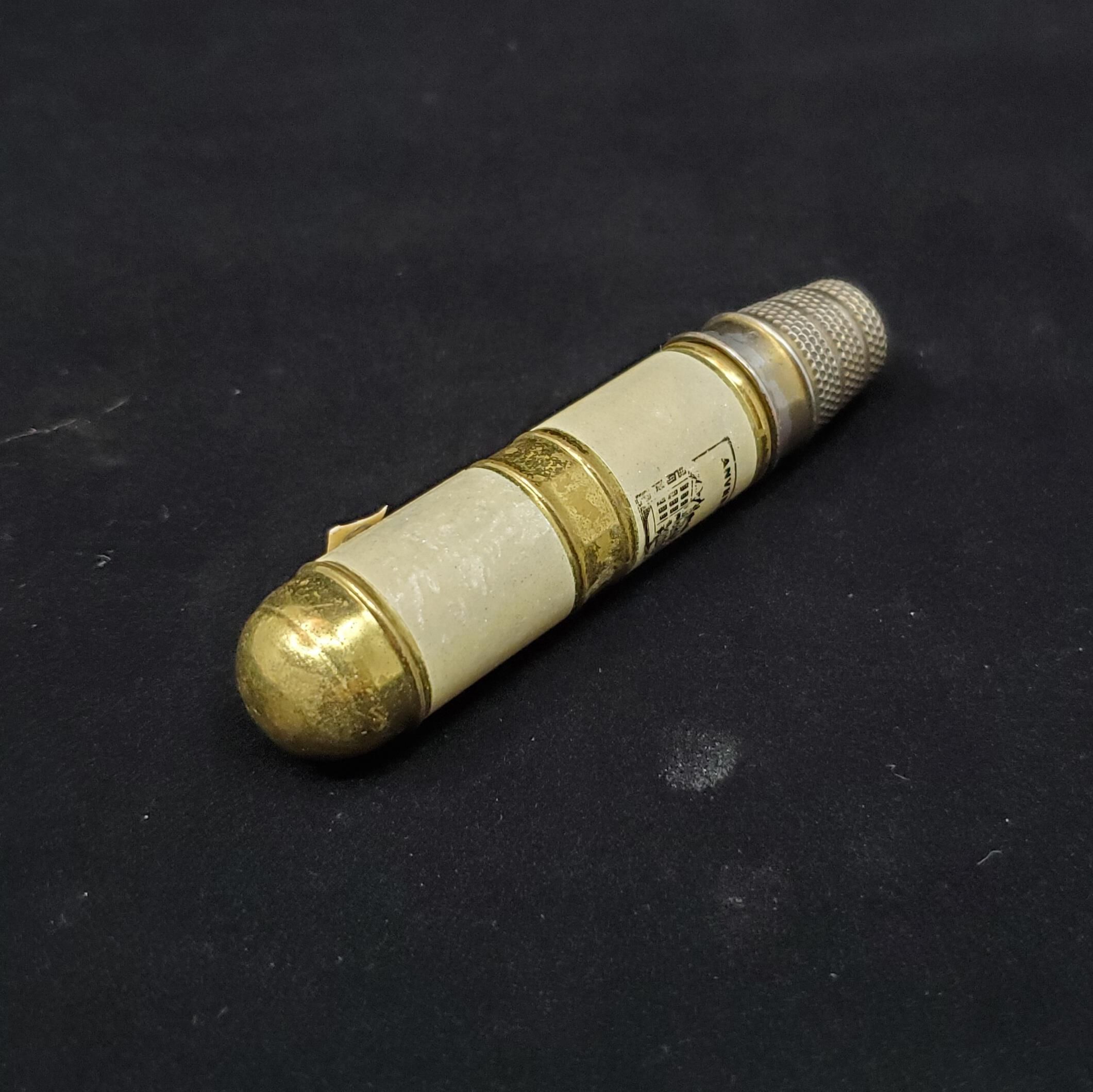Brass sewing kit with thimble top. Brass spindle inside - 4 spools of thread . Spindle opens for needles. Outside divided into 2 parts with brass sections between. Decal in black and white of a building with words ÒAnvers Gare CentraÓ(Central station) Top of kit is a 3 tiered thimble. Plain band with raised rim and raised line at top, then 3 bands of knurling with a plain line between to top of thimble. Knurling on top. No marks.