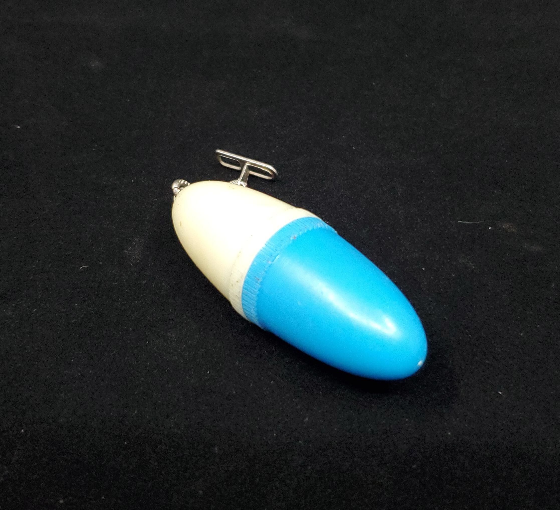 Plastic kit, top white, bottom blue with metal chain 1 1/4Ó at top.Vertical lined narrow band on both parts at opening. Inside 3 thread plastic bobbin with needle holder end and thimble. Brass thimble with rolled rim.Narrow vertical lined band above, then a narrow plain band with Japan stamped oin it. Knurling from here to and over top.