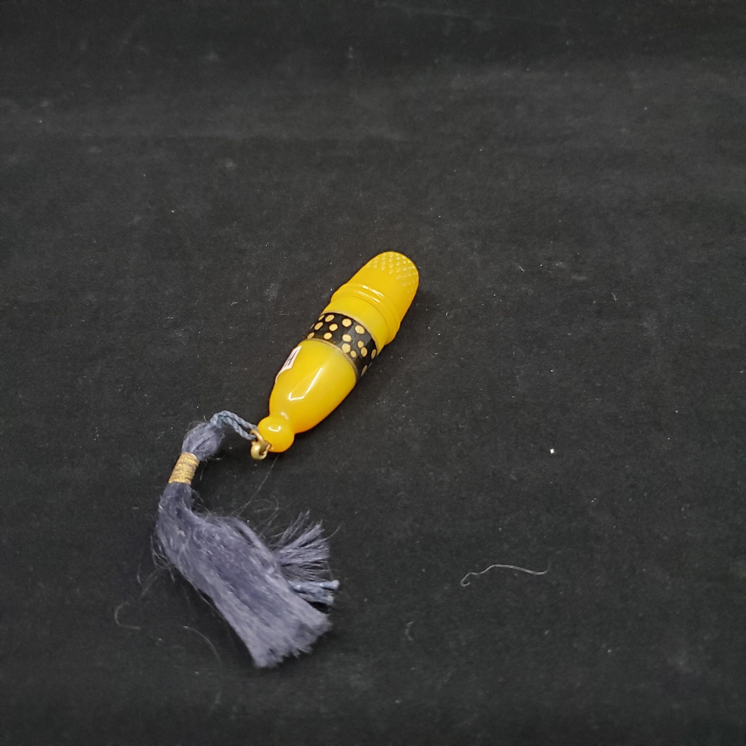 Yellow plastic bullet shaped sewing kit with a band of black and gold dots near middle. End is thimble. Inside white plastic bobbin, 3 thread type with open end for needles, pins. Bobbin has white plastic top. 2 small brass rings one end for black tassel. Yellow plastic thimble wth 2 raised bands near rim forms top of case. Wide plain band above rim then knurling to and over top.