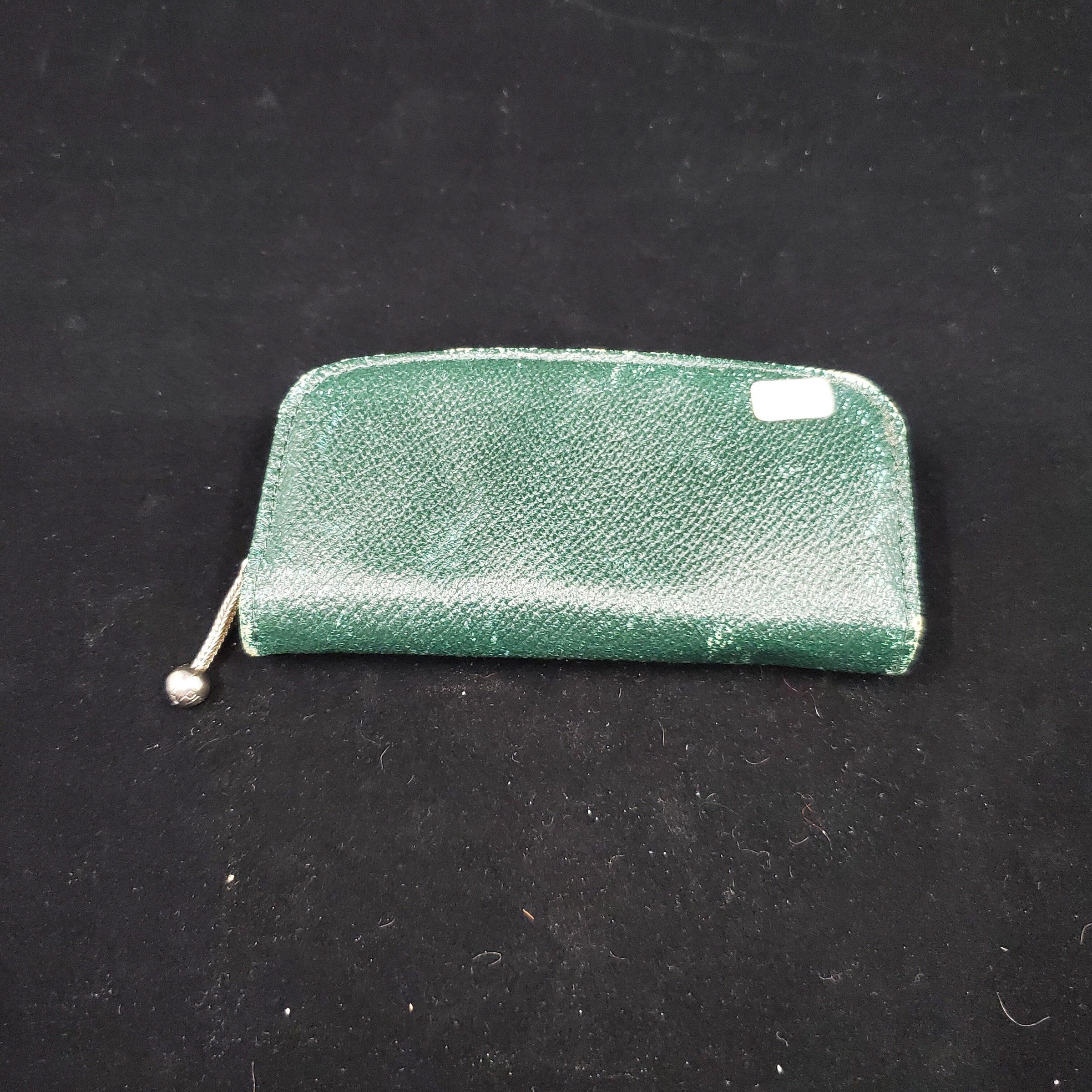 Small green leather zippered sewing kit.Cream coloured cloth lining. Top side has pkt. of needles .Lower side has pseudo tortoise shell (bakelite) bodkin and punch./Metal embroidery scissors and metal thimble.All pieces held by green leather straps. Silver coloured metal thimble with rolled rim.Narrow ribbed band with pattern above, Narrow plain band above with 4 (size) stamped on, then knurling to and over top.No marks.