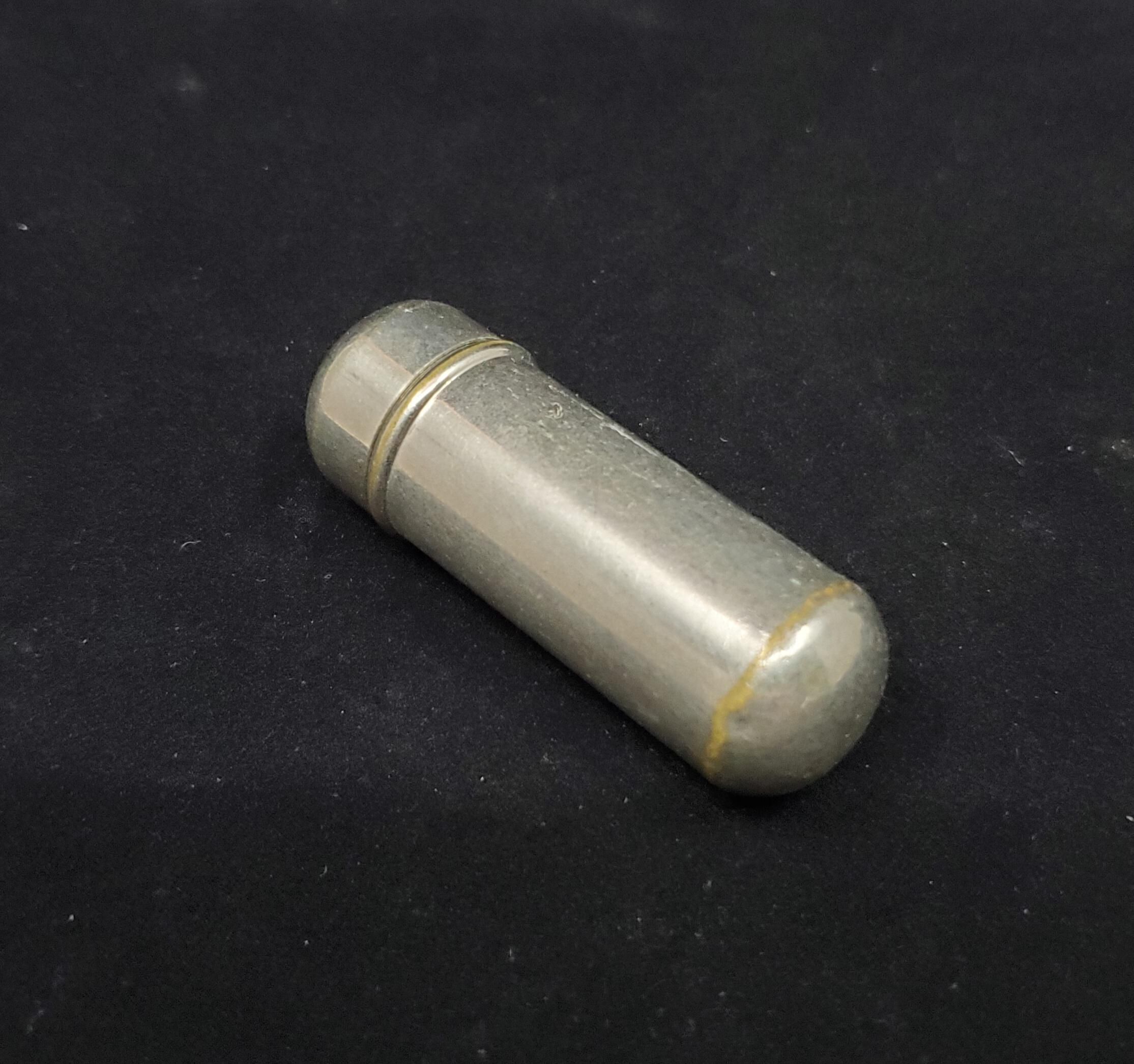 Nickel thimble case with 3 thread metal bobbin,top removeable for needles,etc. Thimble in case but doubtful it is original. Silver thimble, rolled rim.plain narrow band above with English hallmarks,then knurling to and over top. Marks read Birmingham 1907.
