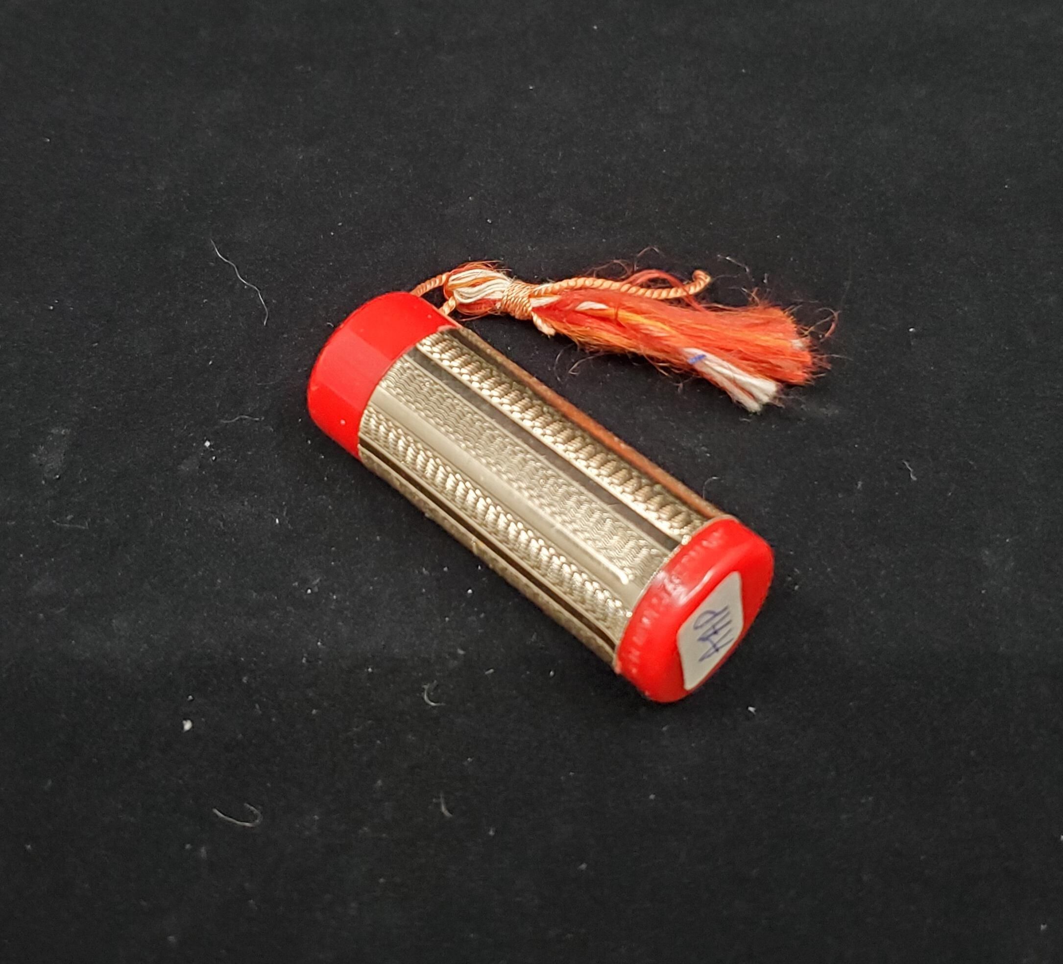 Metal case, gold coloured with linear design with red plastic top and bottom. Red and white tassel from top end. Inside dark red plastic 2 thread bobbin with clear plastic top for pins, inside. Thimble iin case also. Gold coloured metal thimble with narrow raised rim. Wide plain band above with narrow lined bands top and bottom. Knurling to and over top with a plain narrow band half way to top.