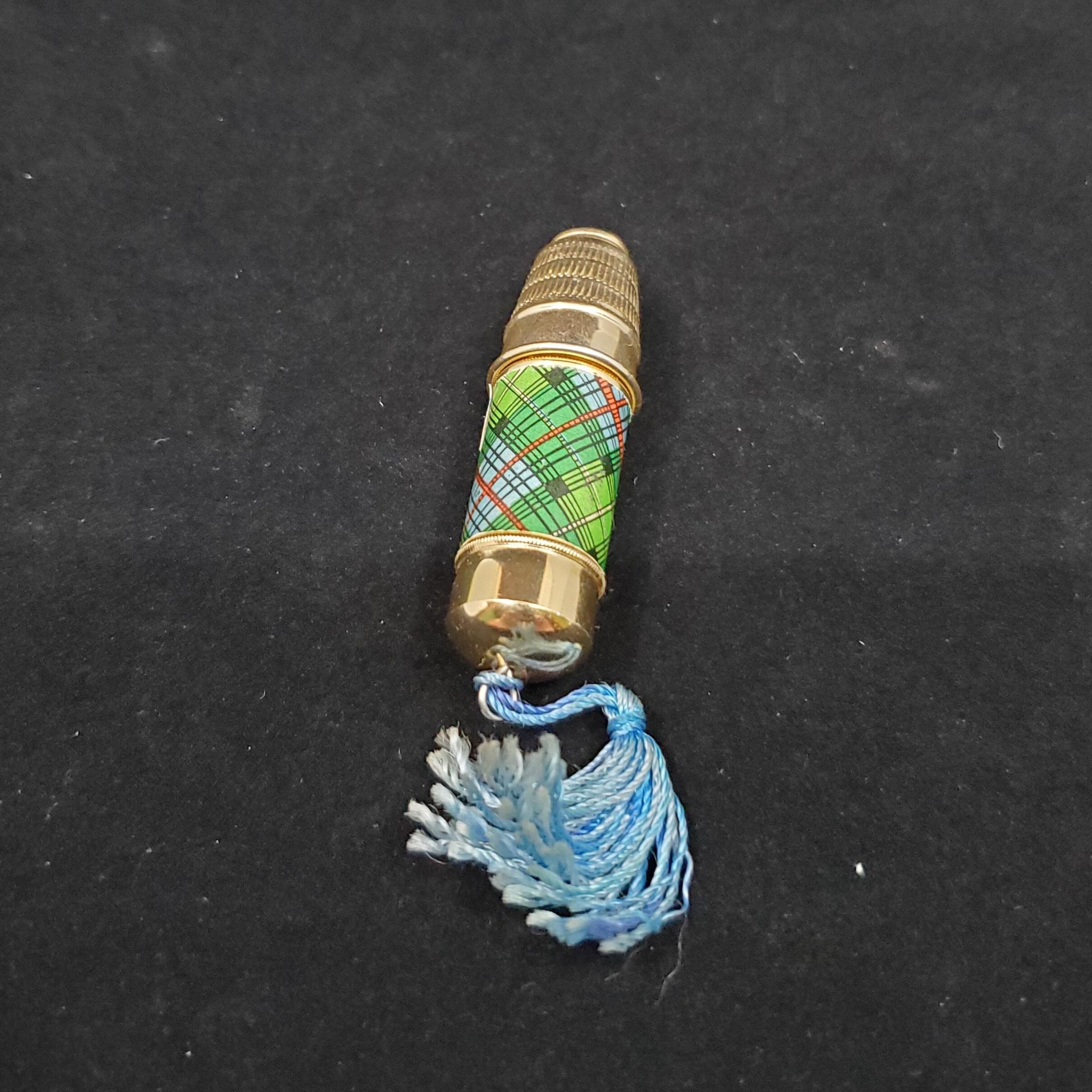 Metal sewing kit with thi,ble top. Bullet shaped gold coloured metal thimble top and gold metal base, Plaid paper pattern - blue,green and red between thimble and base. Blue tassel at base end. Inside mottled blue plastic2 thread bobbin with center for needles, etc. Center clear plastic topped. Gold coloured metal thimble with rolled rim. Wide plain band at rim,knurling of vertical lines to top. Round knuring on top. Thimble forms part of case. No marks.
