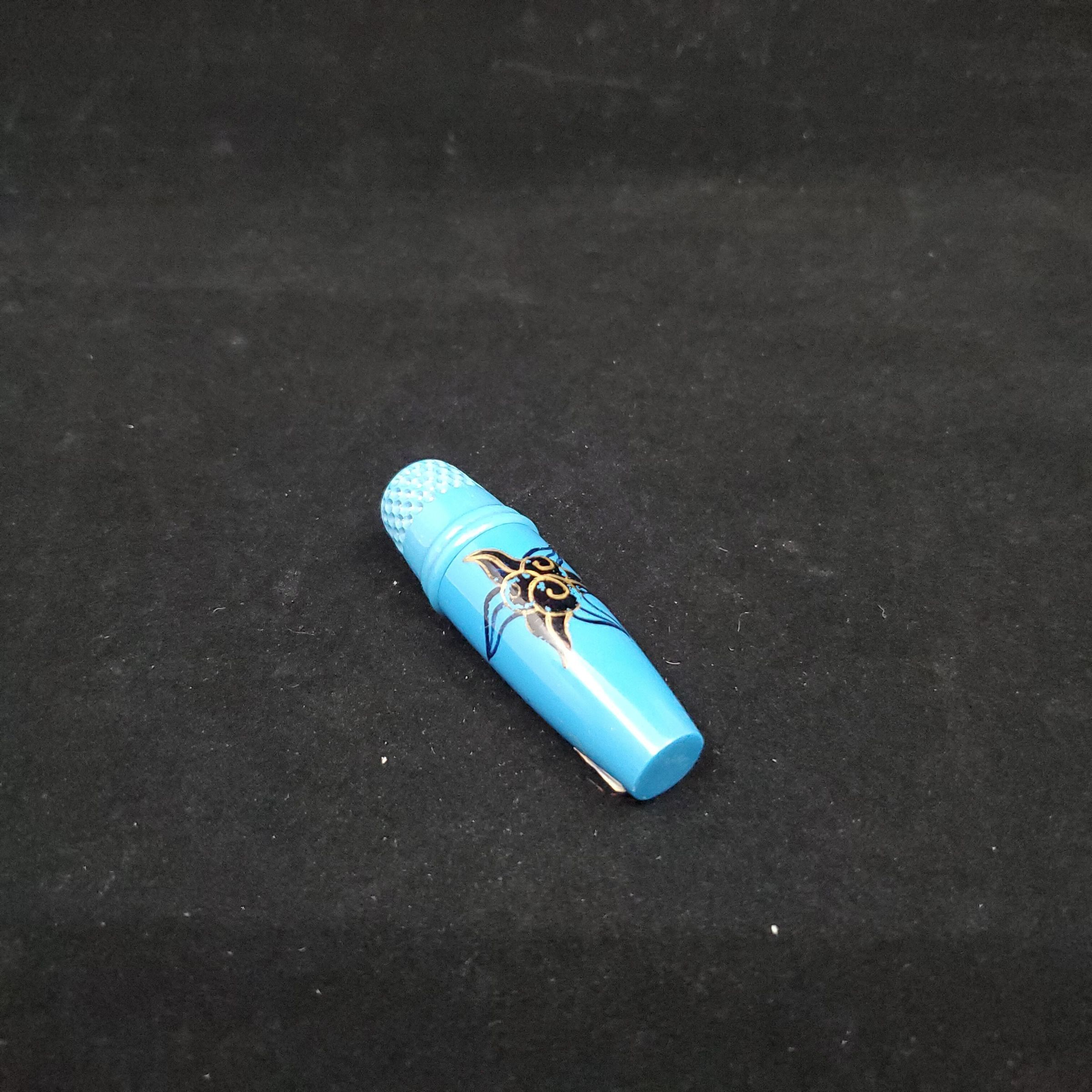 Needle case and thimble, blue plastic case. Black and gold flower and leaf design on outside of cylindrical case. France stamped on bottom. Needles loose inside. Top of case is thimble. Blue plastic - top of case. Raised rim, wide plain band above then knurling to and over top. Screw threads inside