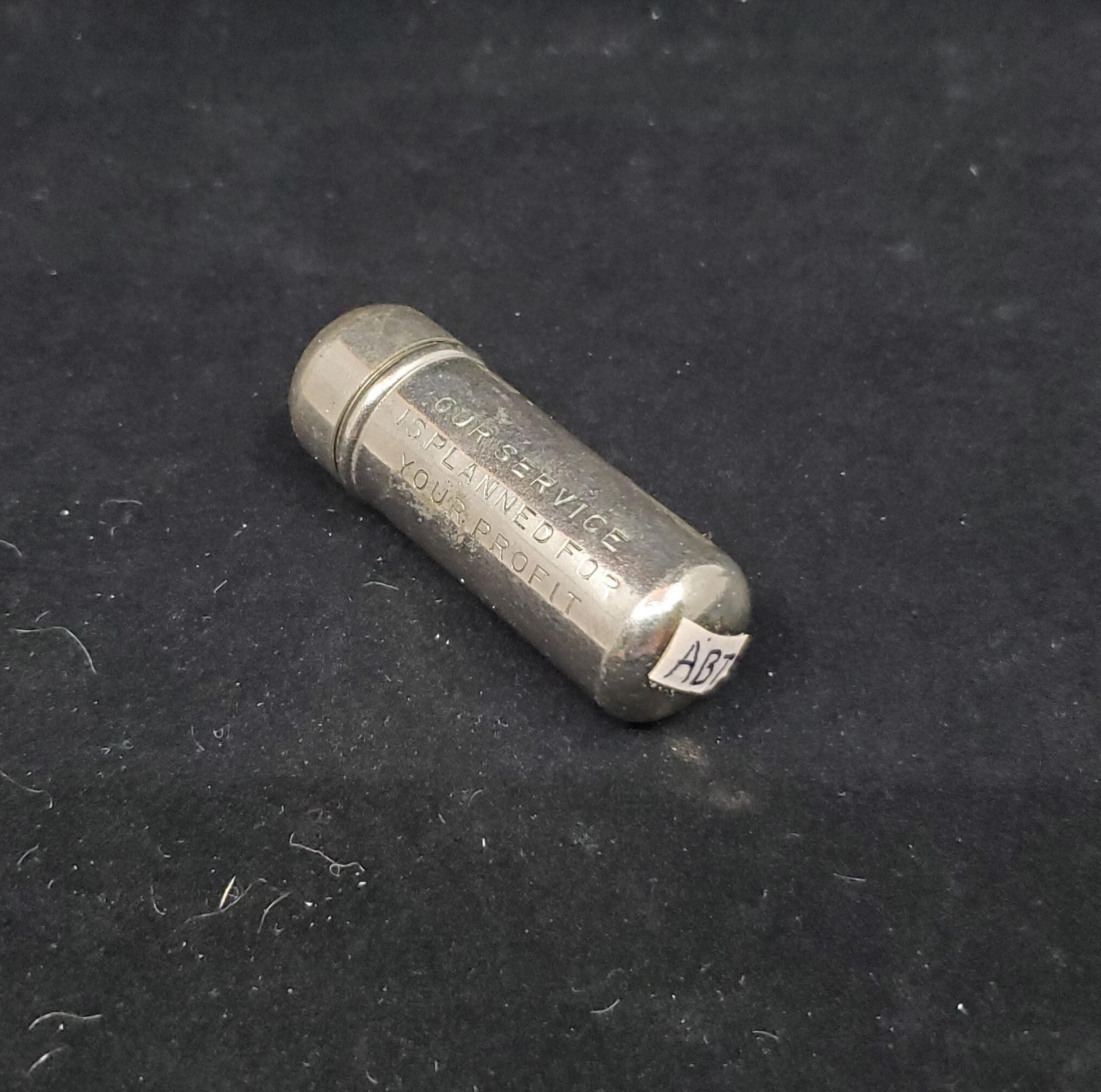 Advertising sewing case.Bullet shapes nickel with ÒOur Service Is Planned For Your ProfitÓ on outside. Insde metal, 2 thread bobbin with inside for needles. Inside has metal top. Aluminum thimble. Aluminum thimble with rolled ribbed rim. Wide plain band above then knurling to and over top. No marks.