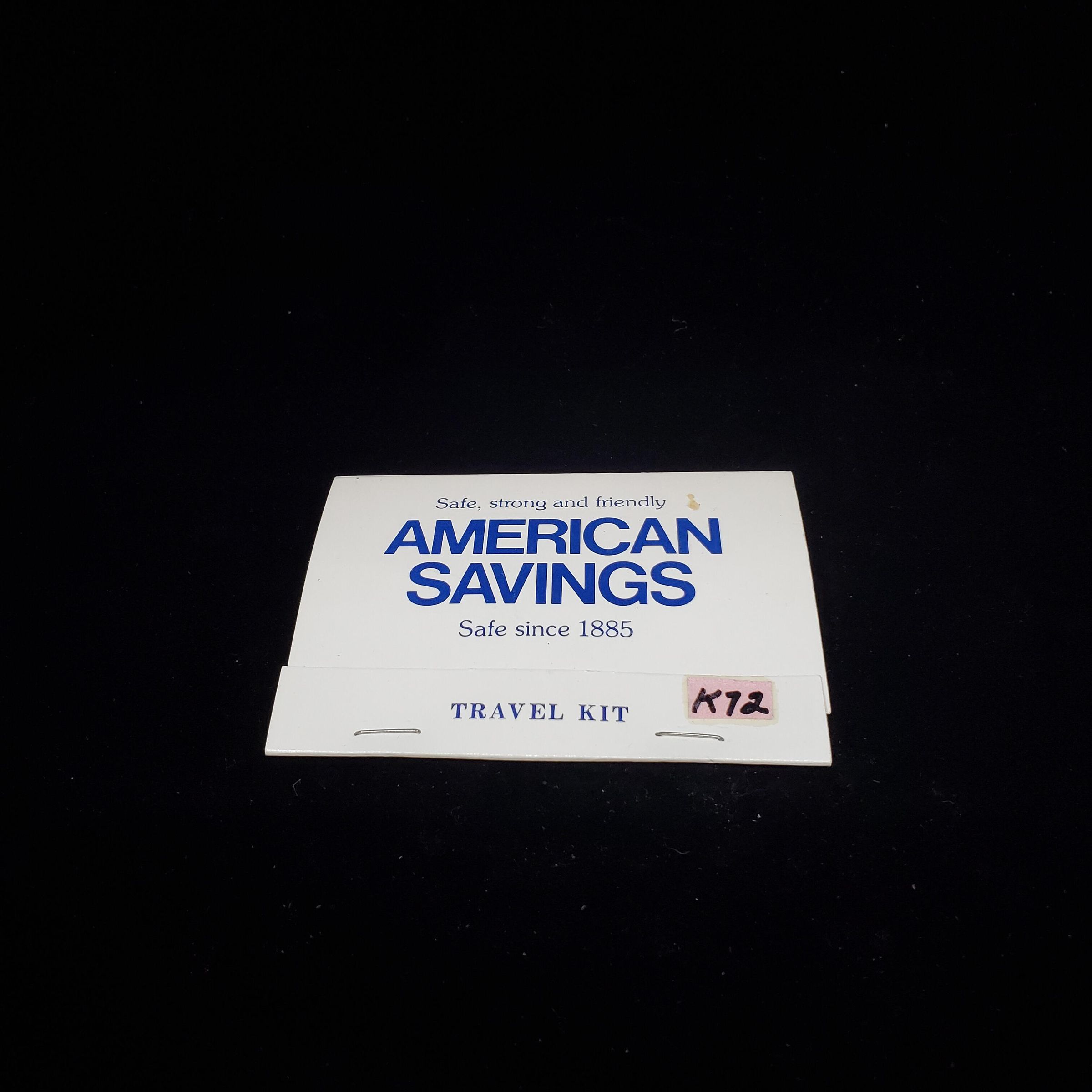 Cardboard Travel sewing and Nail Kit, Advertising. White match folder type kit with blue printing. Advertising ÒAmerican SavingsÓ on front and back. Inside plastic insert with transparent nylon thread,needle, buttons, pins, and 2 short pieces of emery file.