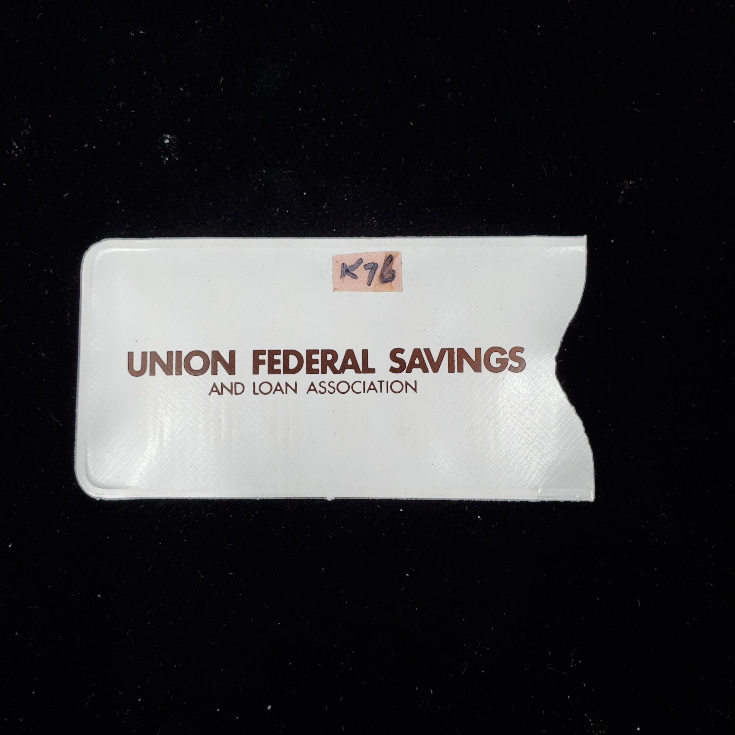 White plastic Advertising sewing kit wiyj brown print. Advertising ÒUnion Federal Savings and Loan AssociationÓ Inside case cardboard with 6 coloured threads, metal threader and needles.