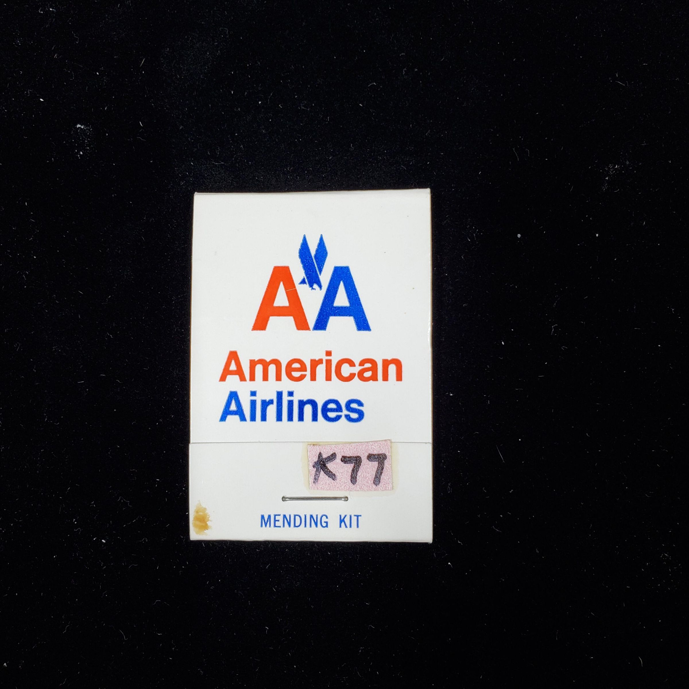 Cardboard Advertising sewing kit, match folder style. White with red and blue print. ÒAA American Airlines Mending KitÓ Inside clear plastic envelope with buttons, pins, needle and a cardboard with different coloured threads.