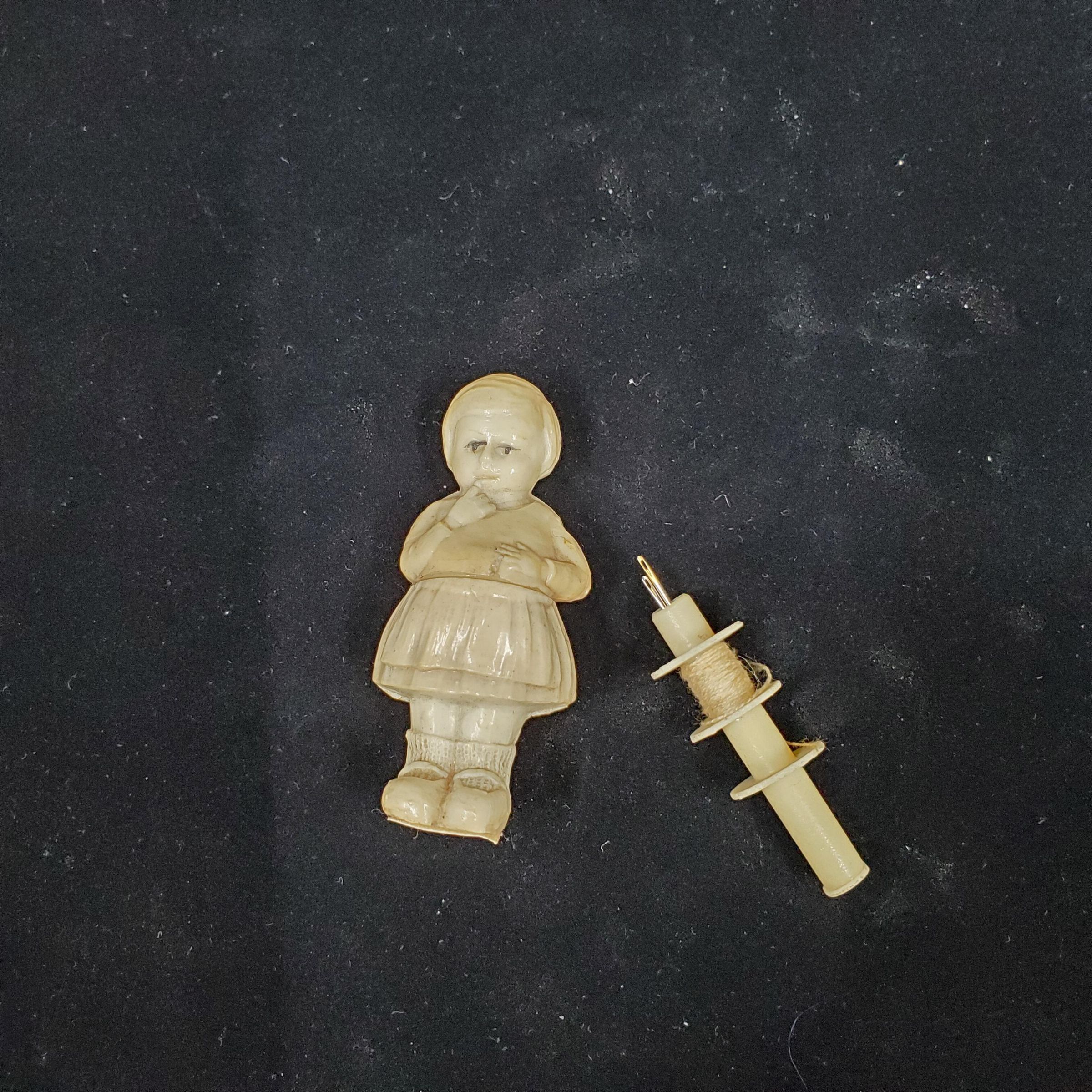 Cream coloured celluloid thread and needle case in form of child. Blond hair, short dress, shoes & socks. Not much sign of colour. Thread bobbin inside but no end to hold needles in.