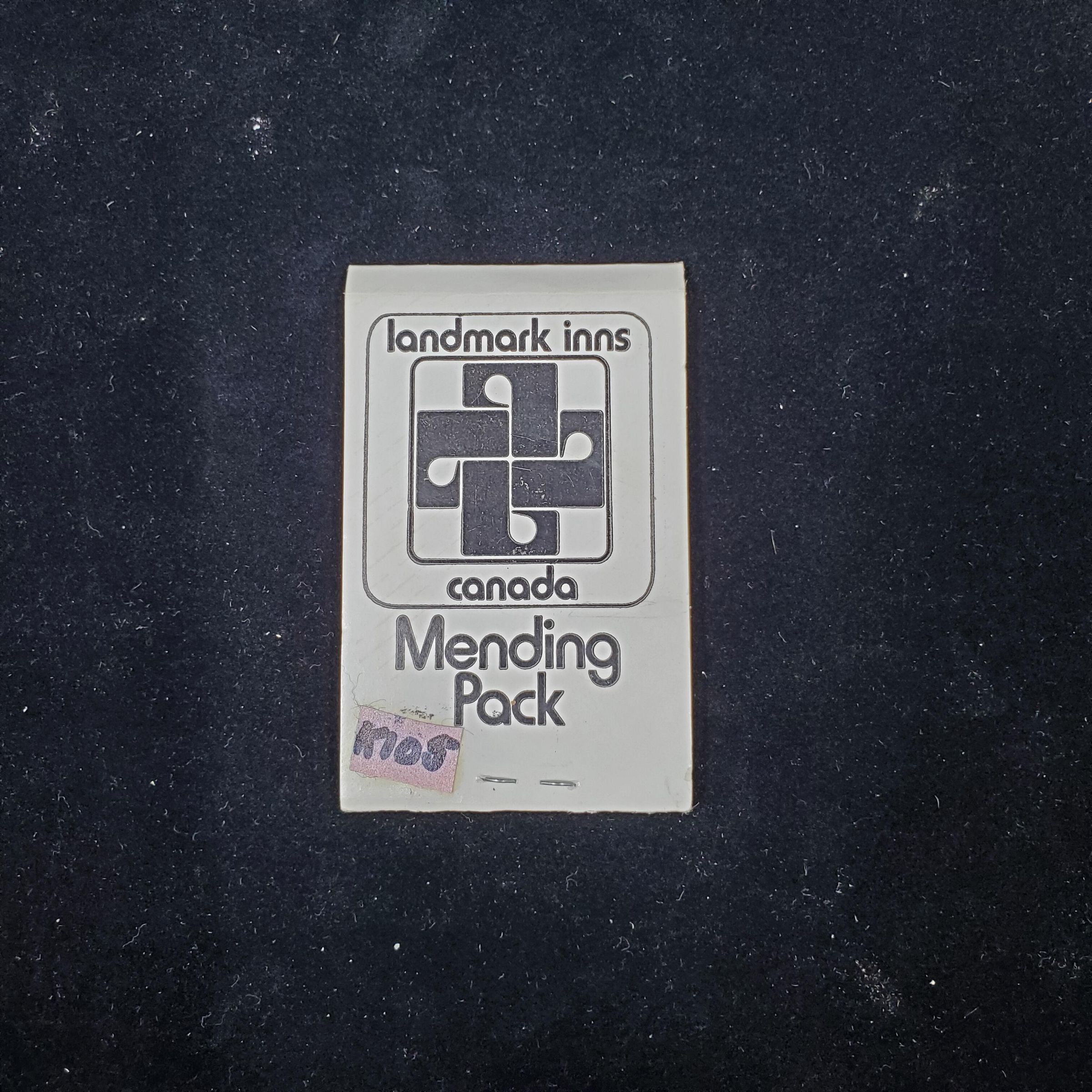 Match folder type sewing kit.. White with black print. Logo on outside with Òllandmark inns canada Mending PackÓ on outside front and back. Inside clear plastic envelope with buttons, coloured threads, needle and safety pin.
