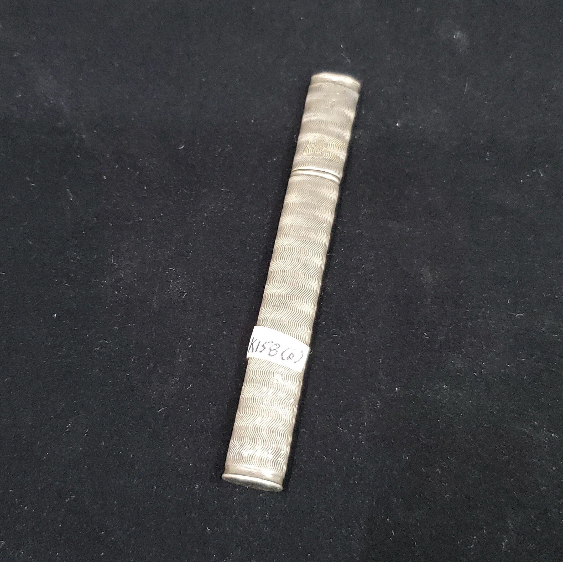 Hand made sewing kit of green velvet with white cord and tassles for decoration. Lined also in green velvet. Inside nickel thimble made in Spain, spool of thread - Drima polyester, and box with folding scissors from the Republic of China. A mix of new & old.
