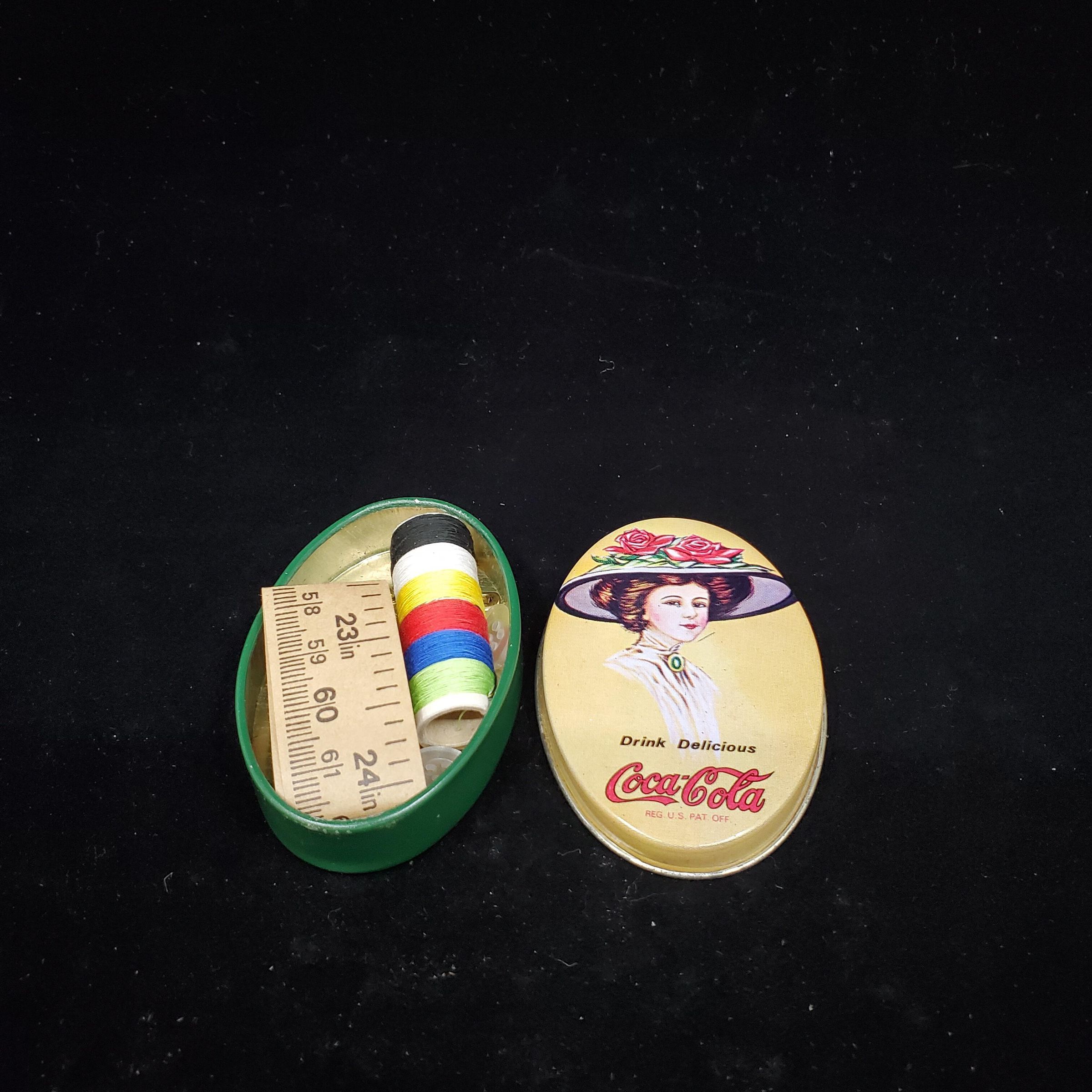 Oval shaped metal sewing kit. Advertising. Top cream coloured background with painyed Gibson Girl head & shoulders, broad brimmed hat with red roses.ÓDrink DelisiousCcoco-ColaÓBottom dark green. Inside needle threader, pins, buttons, needles with coloured threads on roll, paper tae measure. REPRODUCTION.
