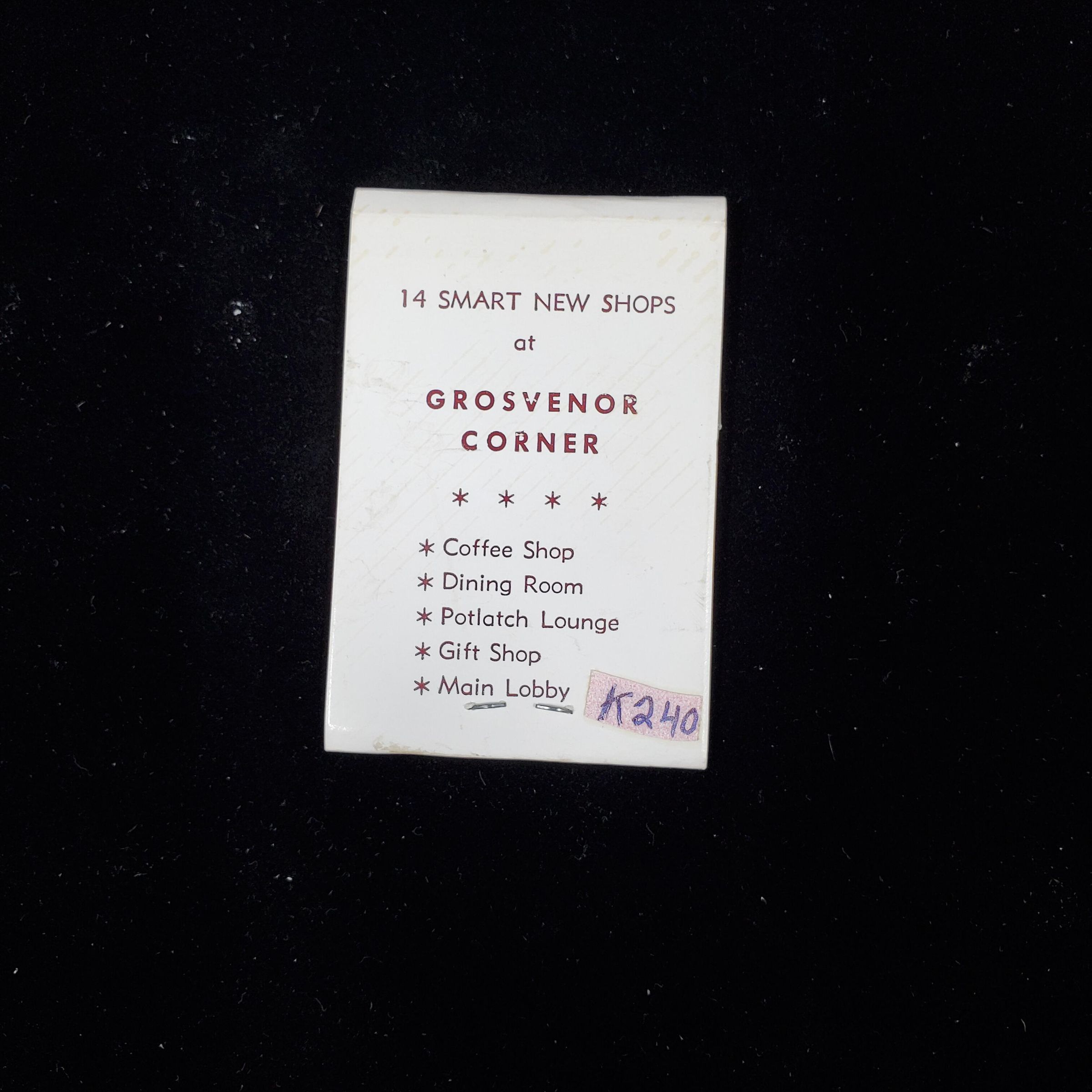 Souvenir Advertising match folder type sewing kit. White witj brown print on outside. Logo inside a large G with ÒGrosvenor Hotel Downtown in Vancuver, British Columbia Drive in Entrance 840 Howe St. Reservsations 681-0141ÓInside Clear plastic envelope with coloured threads, buttons, needle and safetypin. More advertising on back.