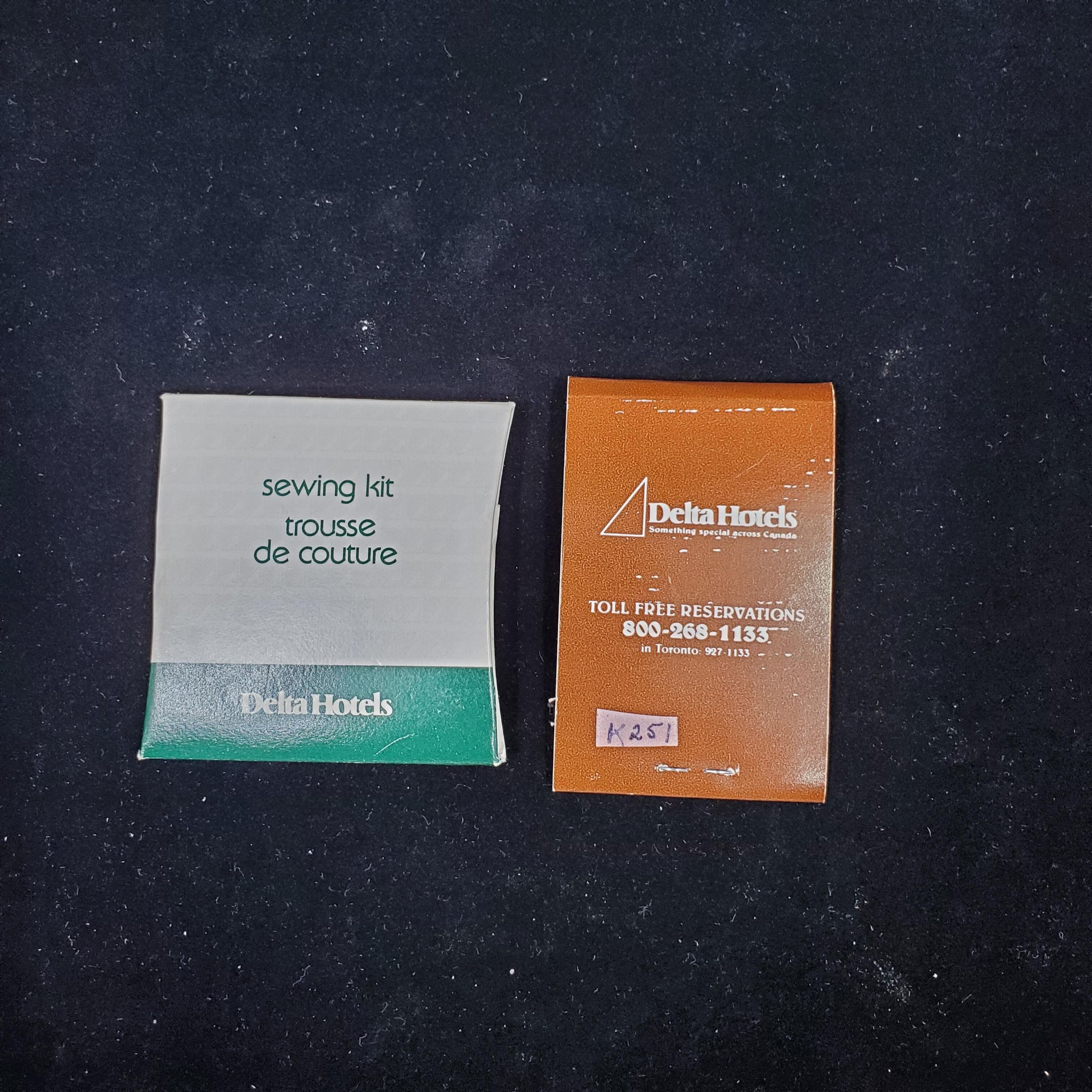 Match folder type sewing kit, Advertising. Cover reads Ò Sewing Kit Trousse de couture Delta HotelsÓ Inside plastic envelope with card of threads, needle, button, pins.