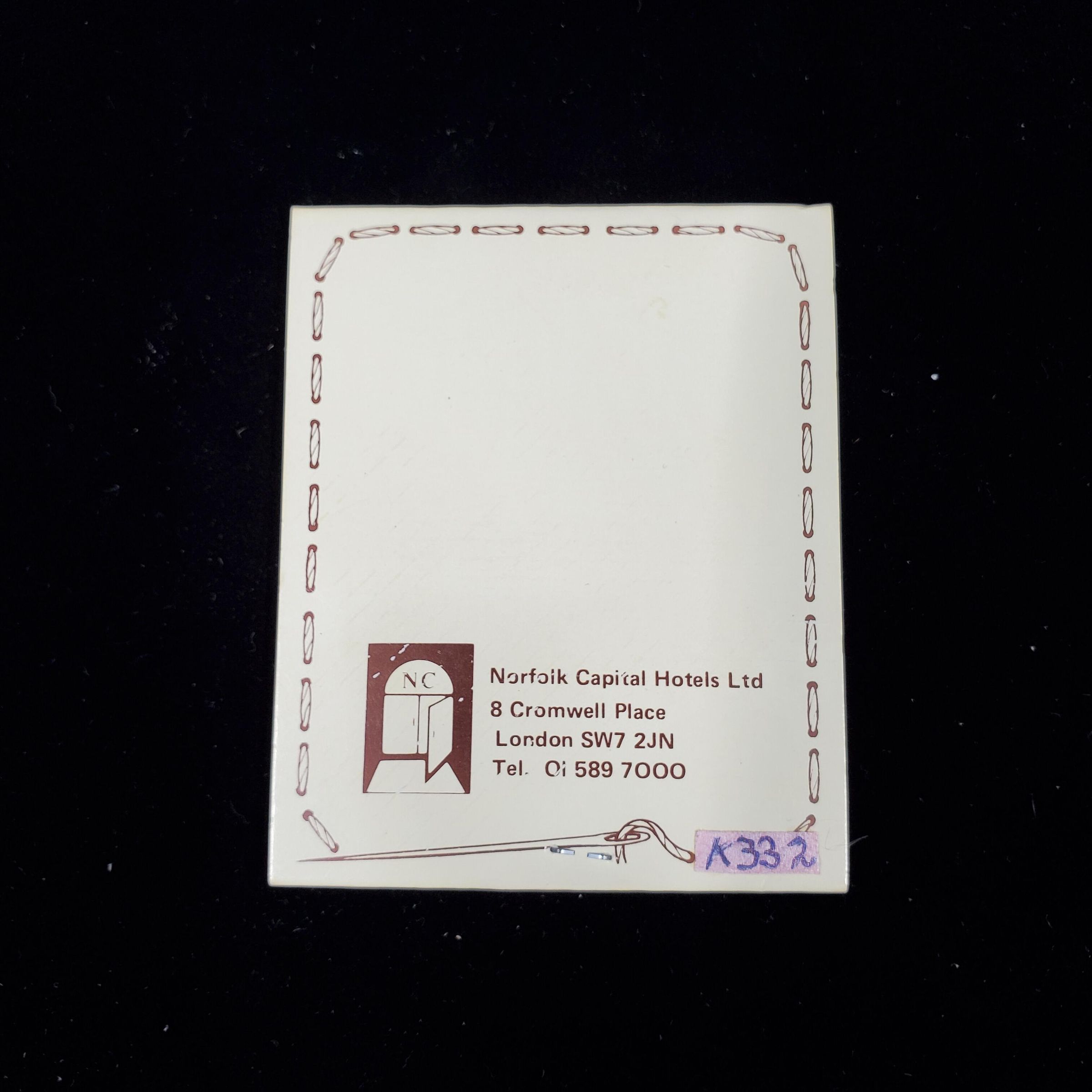 Match folder type Advertising sewing kit. Light cream colour with brown print. Front cover has needle with thread around edge of folder and Òwith compliments of Norfolf Capital Hotels Ò plus logo . Back shows adress of other NC hotels. Inside plastic envelope with threads, needle , pin and buttons.