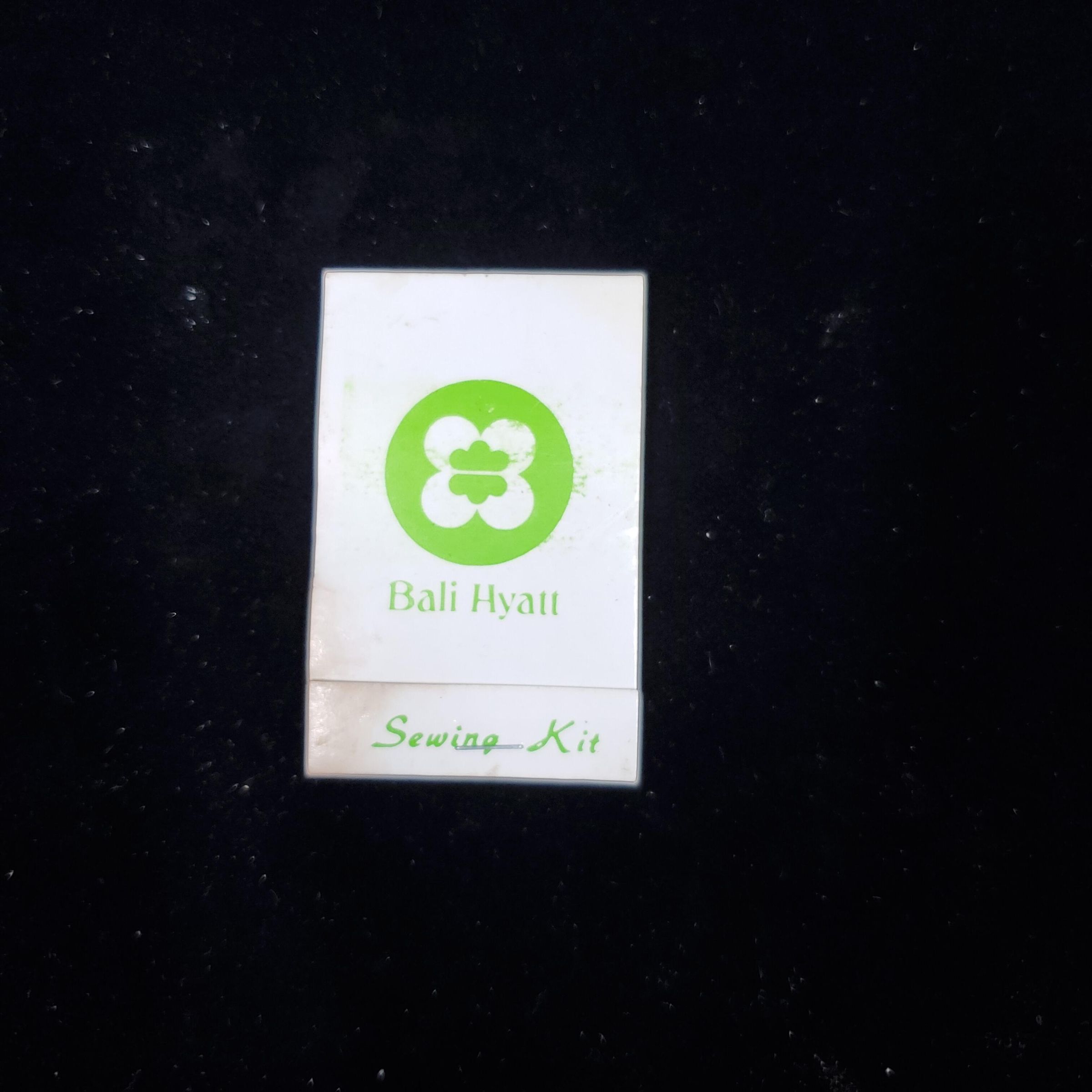 Cardboard match folder type sewing kit. White with green logo and print. Outside has white logo in green circle with ÒBali HyattÓ and ÒSewing KitÓ Back plain white.Inside clear plastic envelope with card for threads but only 2, white and black, on it. (Room for more). ,safety pins, common pins, needles and buttons.