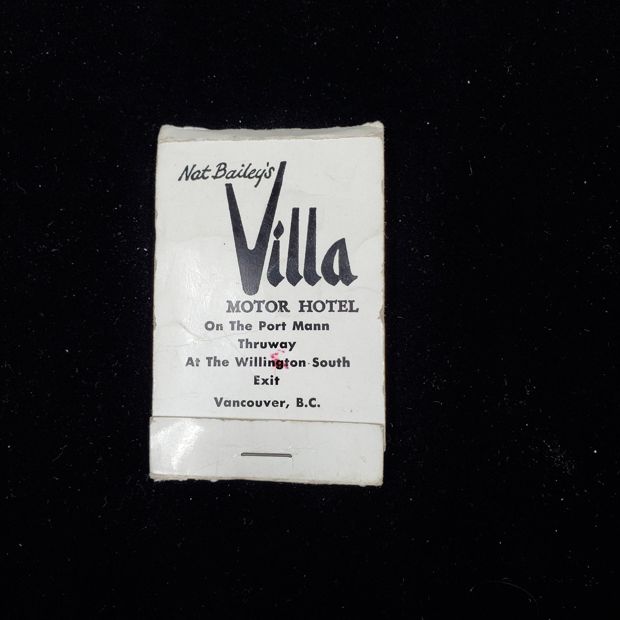 Match folder type sewing kit. White with black print. One side ÒNat BaileyÕs Villa Motor Hotel :Ó plus address. Other side list of benefits. Inside plastic envelope with card of threads. pin, needle and buttons.