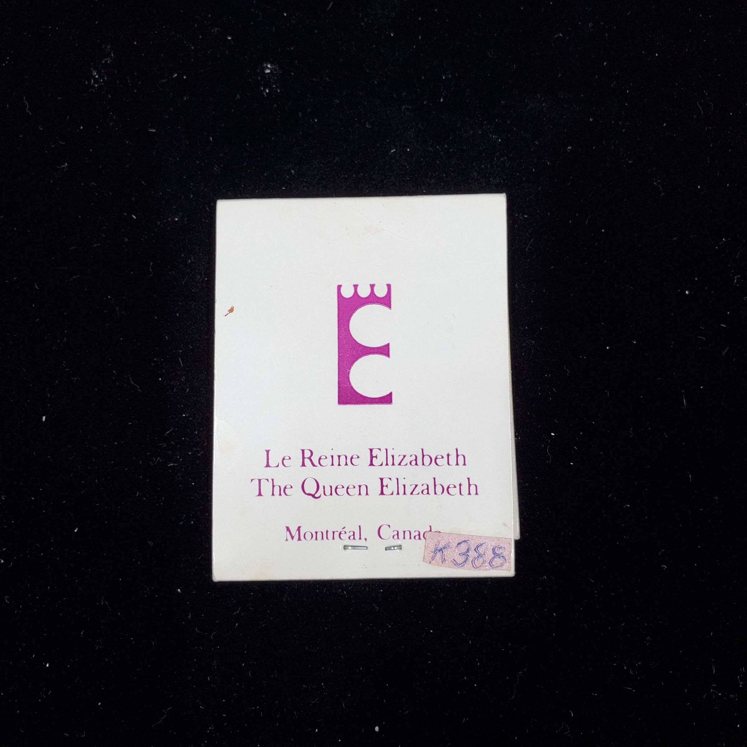 Match folder type sewing kit. White with purple color and print. One side needles, thread and button in purple. Other side large E with top looking like a crown. Below in pourple also Le Reine Elizabeth, The Queen Elizaboth Montreal Canada. Inside plastic envelope with card of threads, needle, buttons and pin.