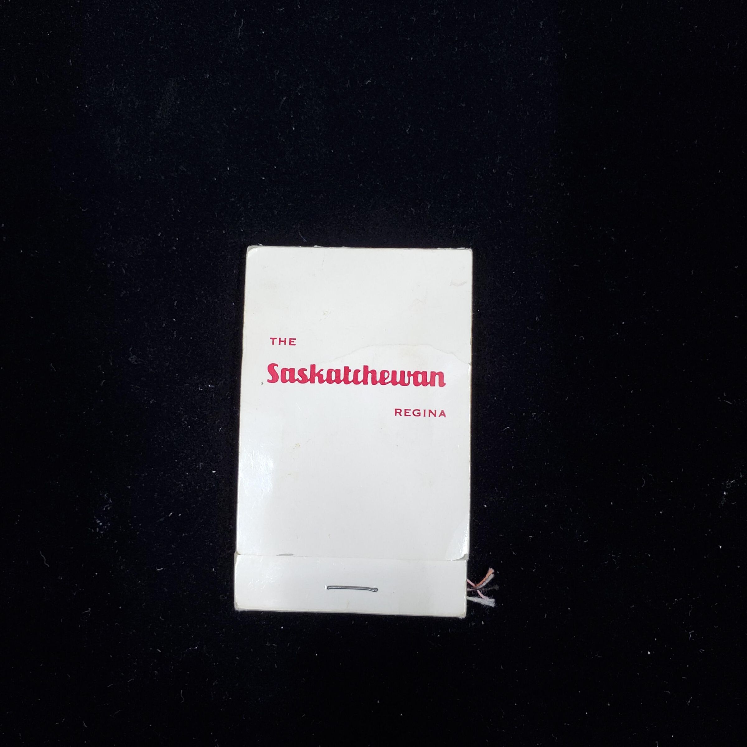 Match folder type Advertising sewng kit. White with red print. Front cover has ÒThe SASKATCHEWAN ReginaÓ in red. Back cover has logo and CP Hotels in red. Inside plastic envelope with threads, needle, pin and buttons.