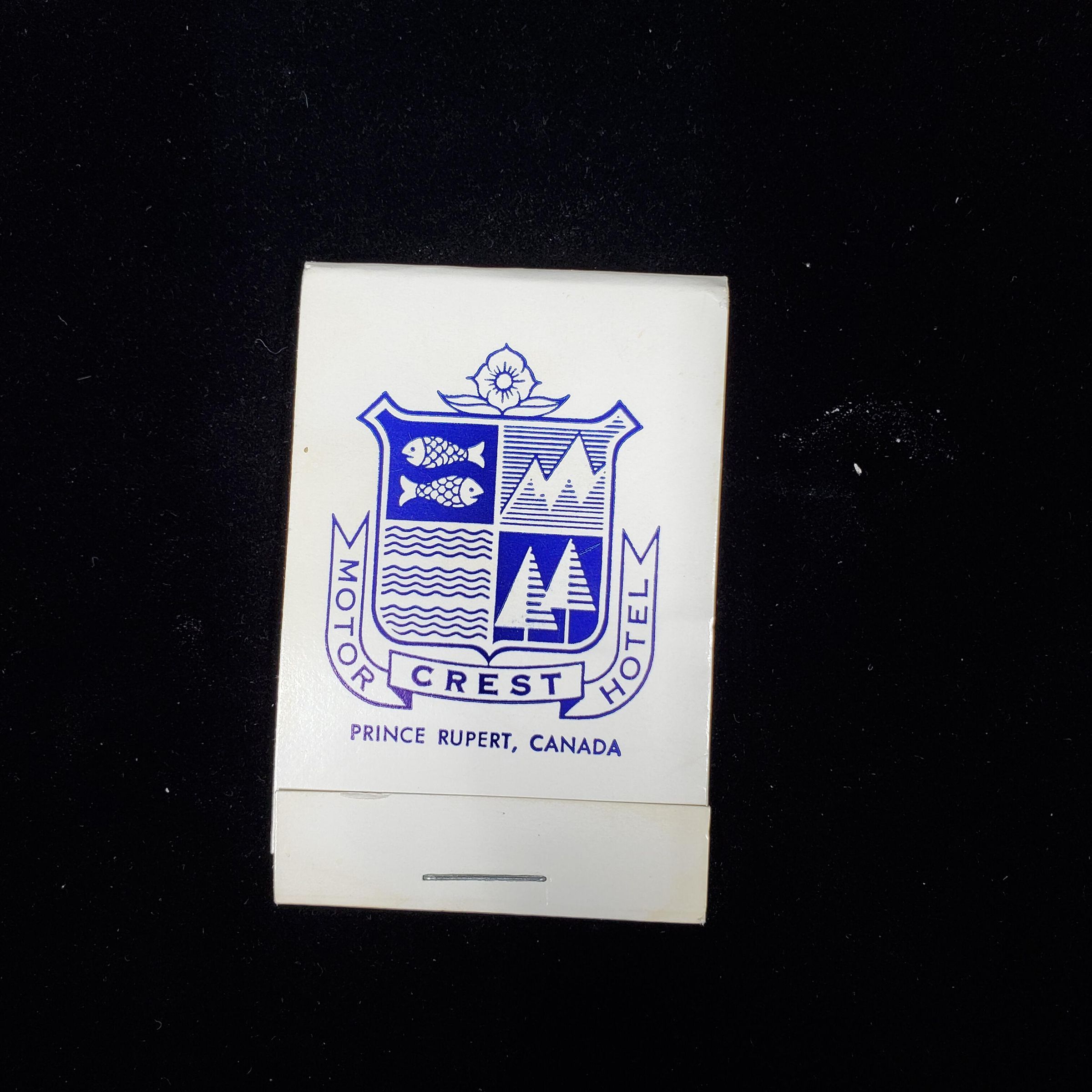 Match folder type Advertising sewing kit. White with blue. Shield or logo on front with dogwood flower on top. Banner around reads ÒCrest Motor Hotel Prince Rupert CanadaÓ Back has more advertising. Inside clear plastic envelope with card of threads, pin, needle and buttons.