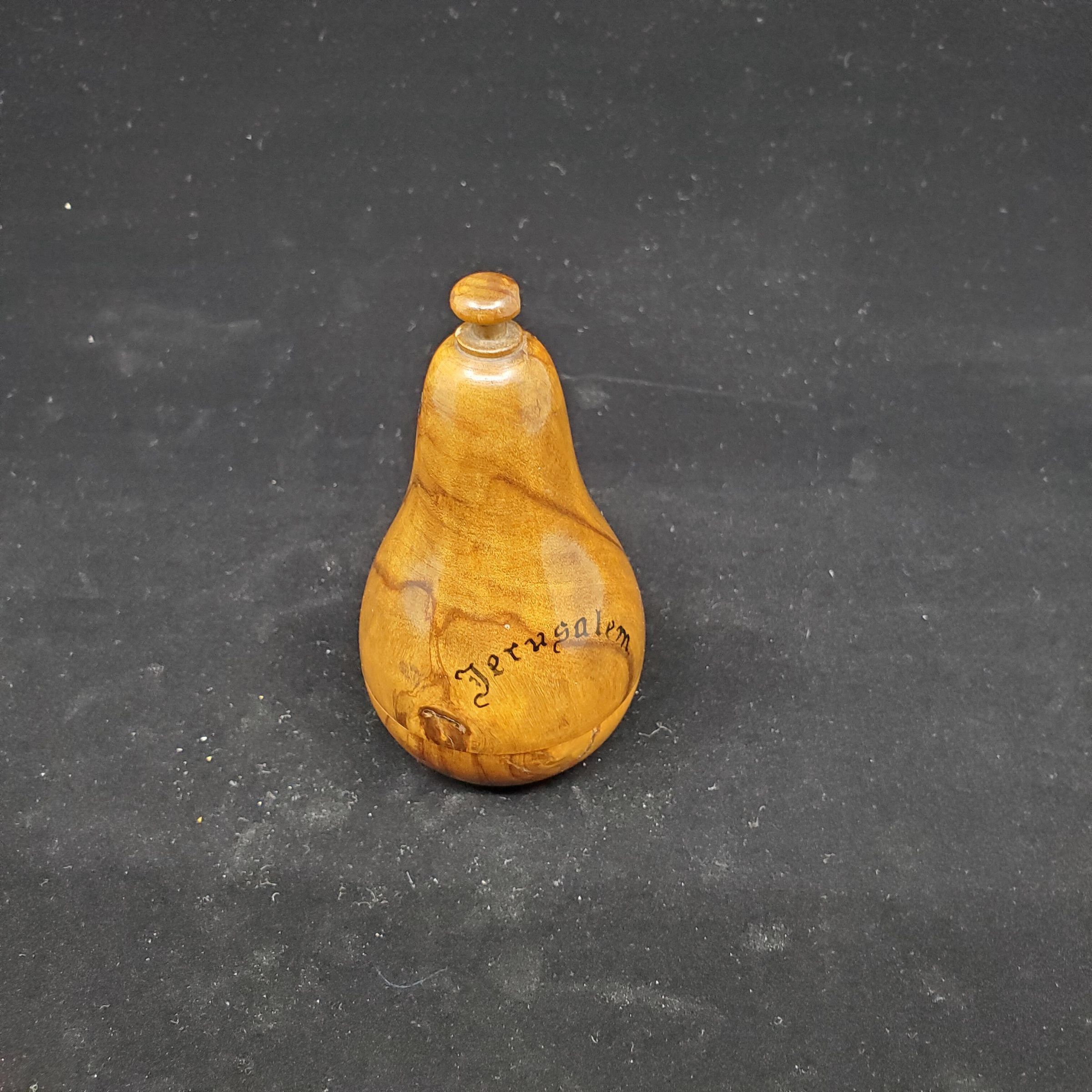 Wooden sewing kit. Souvenir. Pear shaped with screw off top about 1/3 way up.Lovely wood markings ÒJerusalemÓ printed in black on outside. Inside wooden post with removable top for needles. Wooden 2 thread spool to fit over center post. No thimble.