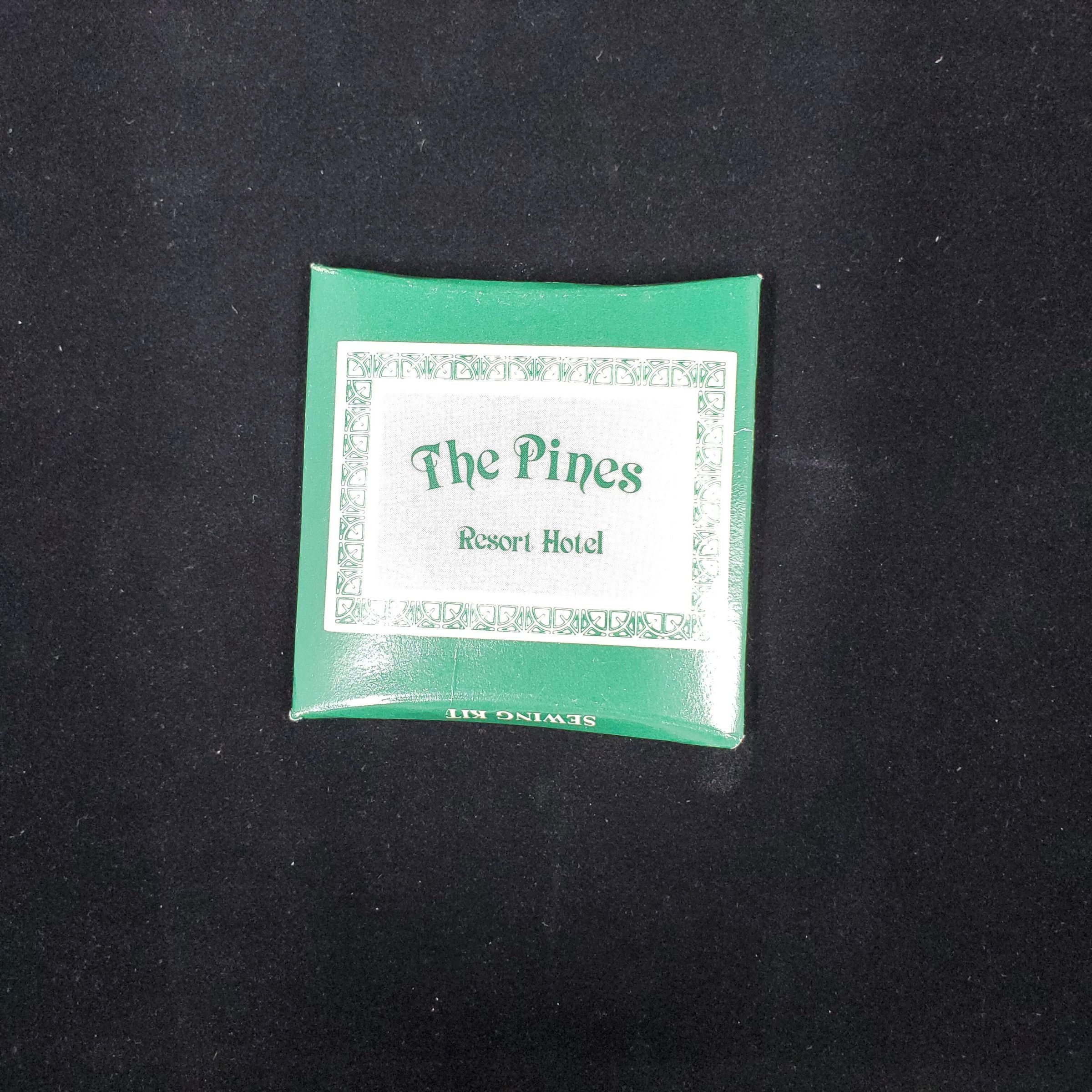 Advertising cardboard sewing kit, envelope style. Green , white and gray colours. Outside cover ÒThe Pines Resort Hotel Sewing KitÓ On back ÒOperated by Tourism Nova Scotia. Inside plastic envelope with card of threads, needle, pin and butons.