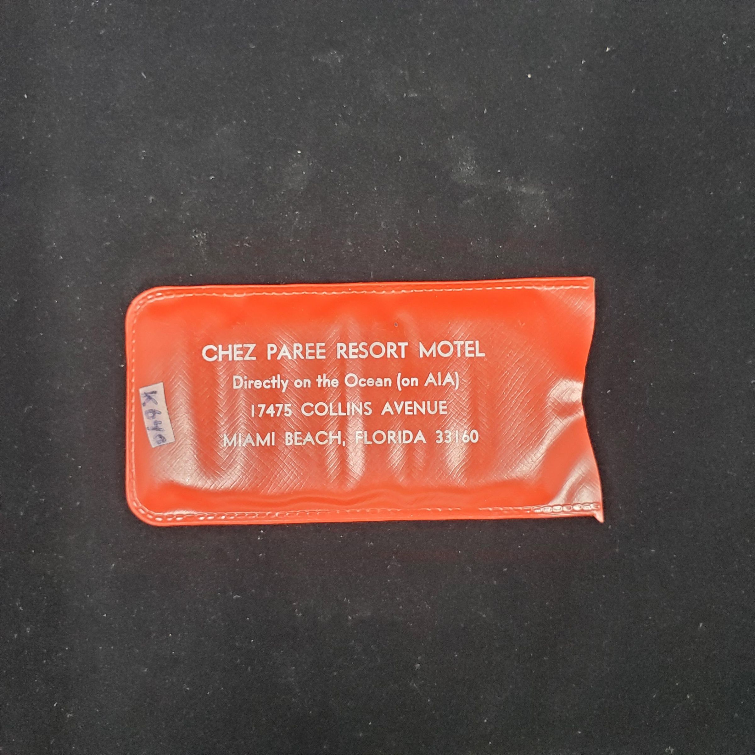Red plastic Advertising souvenir sewing kit Inside cardboard of various coloured threads, metal needle threader, needles, safety pin. Advertising on red cover in white print for ÒChez Paree Resort Hotel Directly on the Ocean (on AIA) 17475 Collins Avenue Miami Beach, Florida 33160Ó