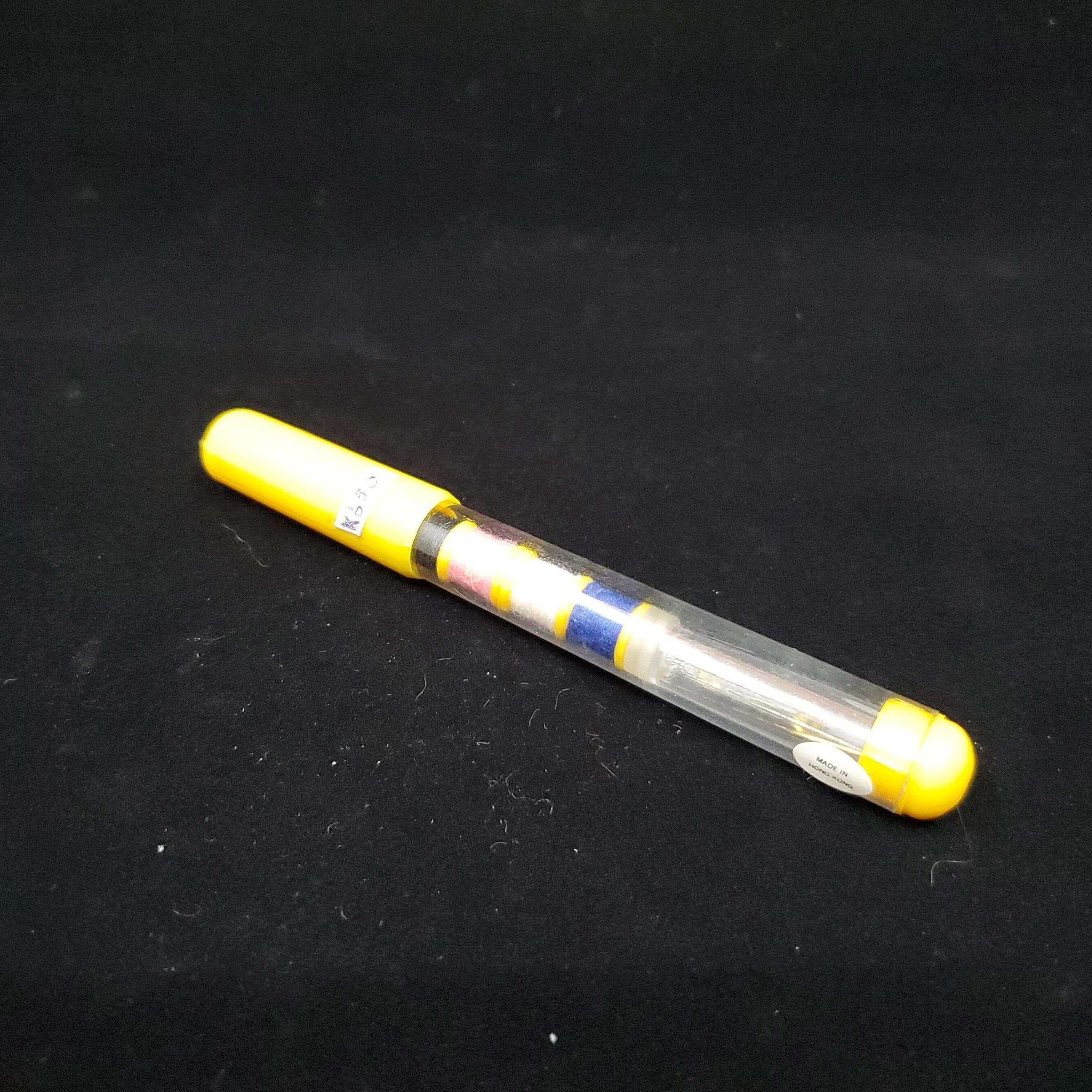 Sewing kit in form of yellow plastic pen. Top & bottom yellow, remander clear plastic. 2Ó(6cm) marked as ruler in black print. Inside 4. small spools thread, pins, needle. On removing top pen nib is usuable. Clip on outside reads ÒMaxyÓ in black print. Paper label reads ÒMade in Hng KongÓ.